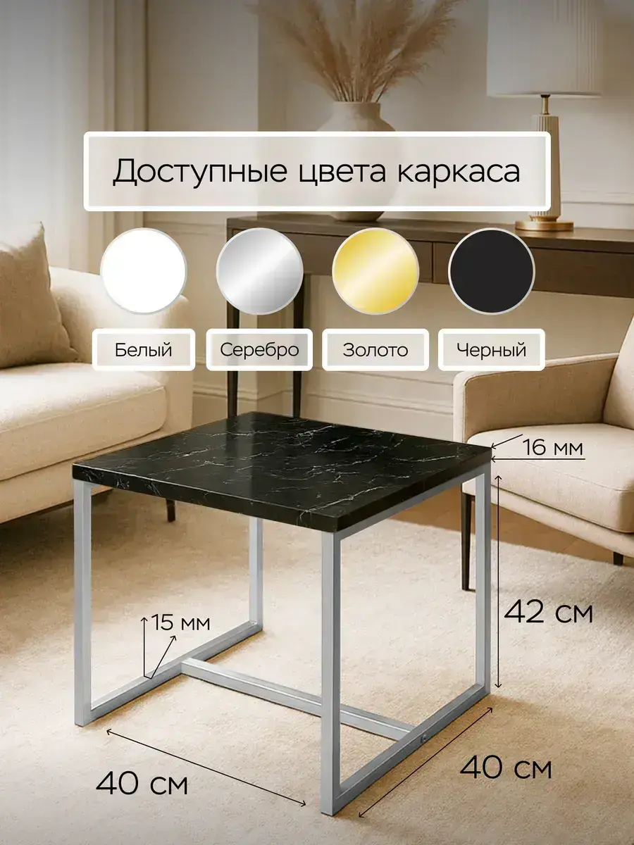 Современный куб-стол с надежным каркасом из металла станет идеальным решением для квартиры, кабинета и загородного дома. Минималистичный дизайн гармонично впишется в любое пространство — от гостиной до рабочего места, от спальни до веранды. Небольшие габариты и надежная конструкция делают изделие многофункциональным: подойдет как журнальный, так и прикроватный вариант, а также как подставка для растений, компьютера или аксессуаров. Прочный металлический каркас обеспечивает долговечность и надежность на долгие годы. Поверхность устойчива к царапинам и легко очищается от загрязнений. Быстрая сборка займет всего 10 минут благодаря понятной схеме — достаточно закрепить верхнюю часть 4 саморезами и соединить каркас 2 винтами. Универсальность предмета дает возможность применения в квартире, творческом пространстве, на загородном участке, в кафе, образовательных и коммерческих помещениях. Благодаря небольшим габаритам мебель легко перемещается по дому и быстро находит применение в любой обстановке. Стол отлично подойдет как журнальный в гостиной или релакс-зоне для размещения чашек, книг и журналов. В спальне он станет удобной прикроватной тумбой для лампы, телефона и личных вещей. Мебель можно применять как подставку для растений, создавая уютные зеленые уголки в интерьере. Компьютер, принтер или другие устройства найдут свое применение на устойчивой поверхности. В рабочих помещениях куб станет практичным решением для переговорных и холлов ожидания. Кафе и рестораны оценят его как стильный кофейный вариант для посетителей. На веранде или в саду мебель создаст комфортную атмосферу для отдыха и чаепития. Образовательные учреждения смогут применять изделие как дополнительный стол для занятий и творчества. Куб-стол сочетает в себе стиль, функциональность и долговечность, становясь незаменимым помощником в организации любого пространства