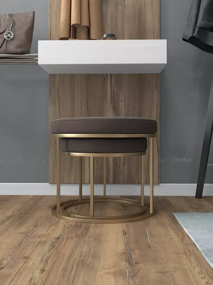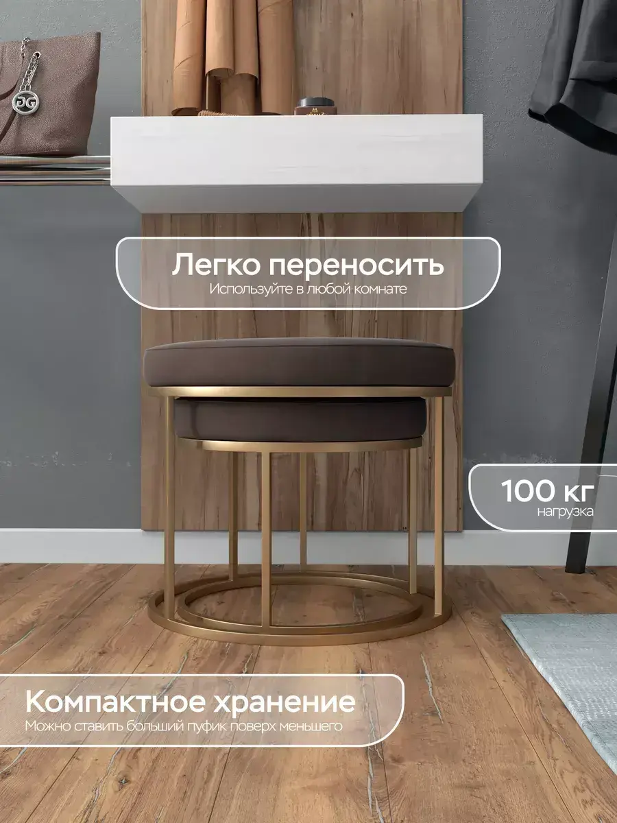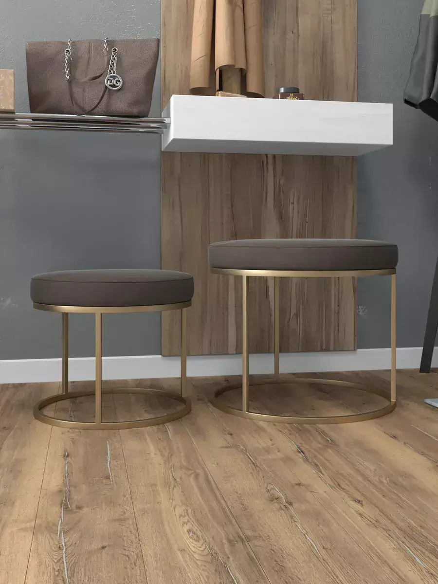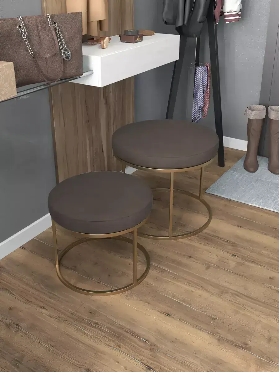Пара пуфиков для гостиной — это стильный и функциональный предмет мебели. Они имеют прочное металлическое основание и мягкое сиденье, что делает их удобными и долговечными. Металлическое основание обеспечивает надёжность и прочность пуфиков, позволяя использовать их не только как сиденья, но и как небольшие столики или подставки для ног. Их конструкция позволяет легко перемещать пуфики по комнате, делая их универсальным решением для любого интерьера. Мягкая обивка пуфиков изготовлена из высококачественных материалов, которые сохранят свою первоначальную форму и цвет на протяжении долгого времени. Пуфики идеально подходят для гостиной, где они будут стильным акцентом и функциональным элементом. Вы сможете использовать их как дополнительное сиденье для гостей, как подставку для ног или как столик для различных предметов. Благодаря своим компактным размерам, пуфики не займут много места в вашей гостиной и легко впишутся в любой интерьер.