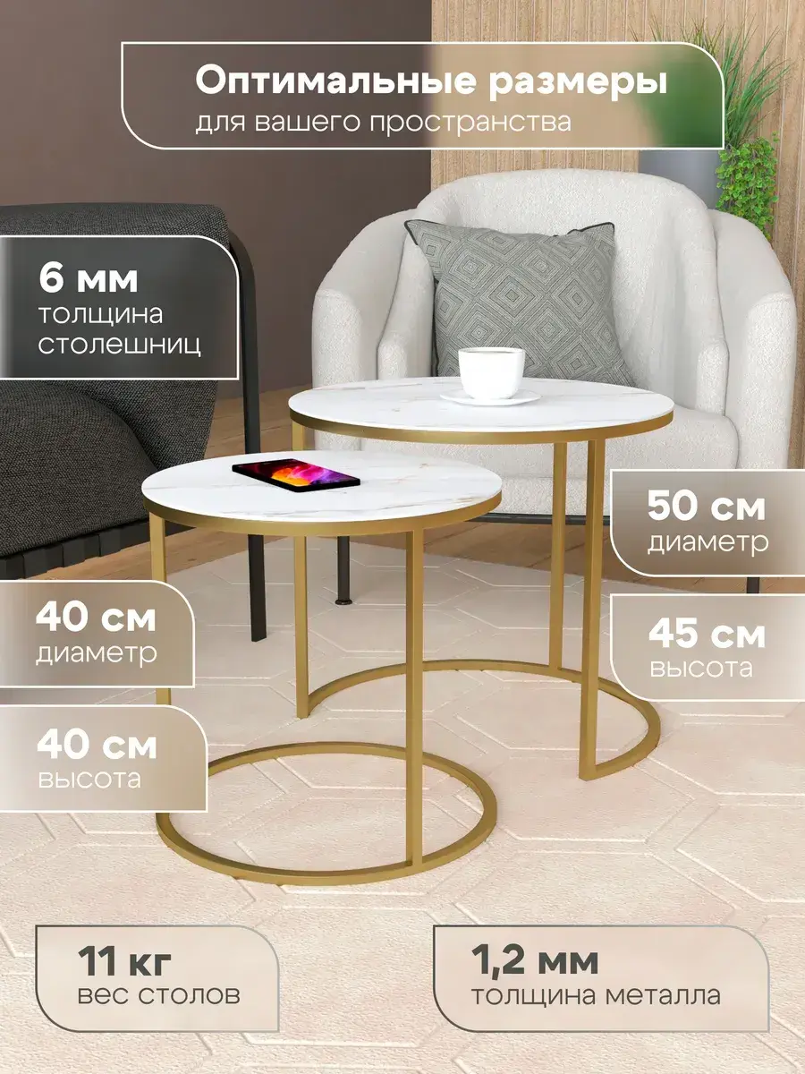 Воплотите свои дизайнерские идеи в жизнь с помощью этого стильного круглый журнальный столик. Этот стильный комплект включает два стола: большой диаметром 50 см и высотой 45 см, а также малый диаметром 40 см и высотой 40 см. Универсальный приставной столик станет идеальным дополнением к любому дивану или креслу. Современный стиль подчеркивает вкус владельца. Журнальный столик круглый выполнен в лучших традициях современного дизайна. Этот стол круглый по форме идеально подходит для создания гармоничного пространства. Вы можете выбрать из 24 вариантов цветовых решений, что позволит идеально вписать столики в ваш интерьер. Закажите сегодня и получите не просто мебель, а произведение искусства!