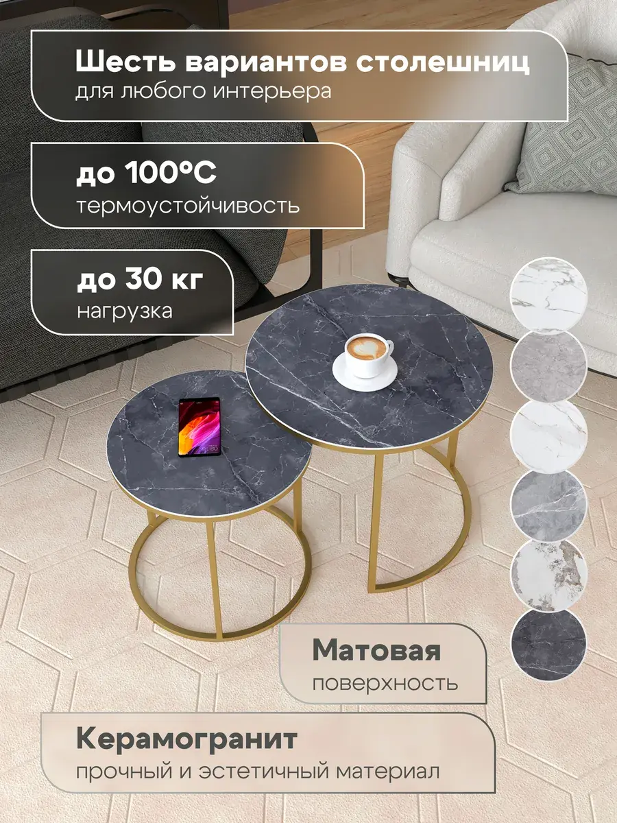Откройте секрет идеального интерьера с помощью этого изящного круглый журнальный столик. Этот стильный комплект включает два стола: большой диаметром 50 см и высотой 45 см, а также малый диаметром 40 см и высотой 40 см. Этот прикроватный столик станет центральным элементом вашего интерьера. Благородный керамогранит столешницы создает ощущение роскоши. Этот стол круглый по форме идеально подходит для создания гармоничного пространства. Стол журнальный выполнен в лучших традициях современного дизайна. Вы можете выбрать из 24 вариантов цветовых решений, что позволит идеально вписать столики в ваш интерьер. Не упустите возможность приобрести этот шедевр дизайна уже сегодня!