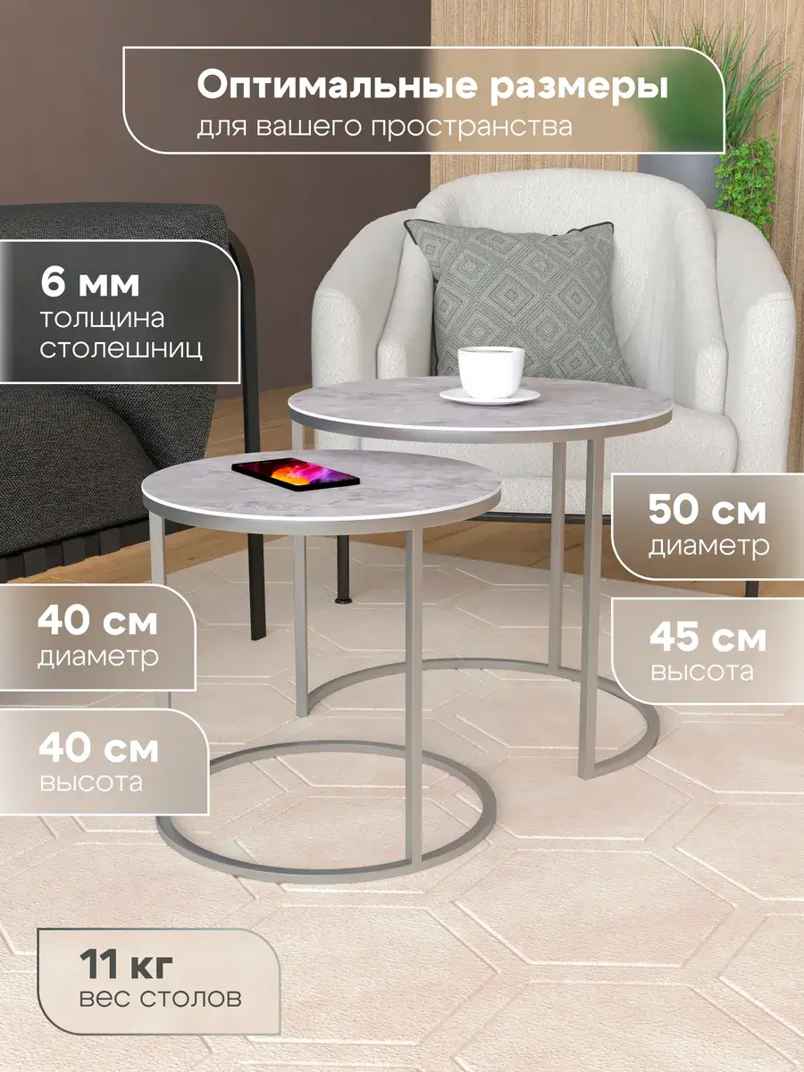 Создайте магию домашнего тепла с этим невероятно стильным круглый журнальный столик. Этот стильный комплект включает два стола: большой диаметром 50 см и высотой 45 см, а также малый диаметром 40 см и высотой 40 см. Универсальный приставной столик станет идеальным дополнением к любому дивану или креслу. Элегантные металлические ножки с полиуретановым покрытием обеспечивают надежность. Как кофейный столик, он создаст уютную атмосферу для утреннего кофе или вечернего чая. Вы можете выбрать из 24 вариантов цветовых решений, что позволит идеально вписать столики в ваш интерьер. Закажите прямо сейчас и наслаждайтесь красотой каждый день!