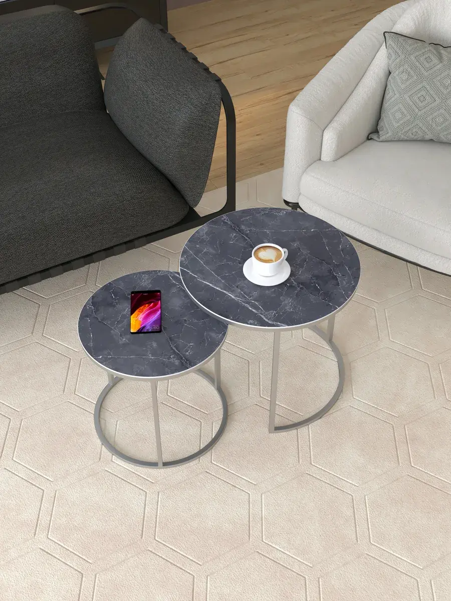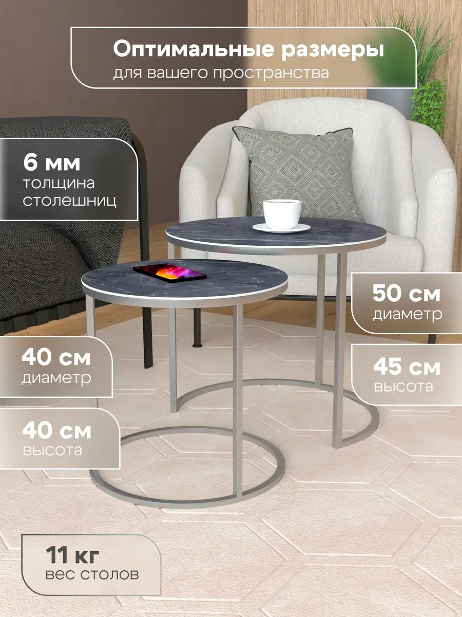 Подарите своему дому частичку вдохновения с этим великолепным круглый журнальный столик. Этот стильный комплект включает два стола: большой диаметром 50 см и высотой 45 см, а также малый диаметром 40 см и высотой 40 см. Этот стол журнальный может использоваться как столик прикроватный, добавляя функциональность в спальню. Высококачественные материалы гарантируют долговечность. Столик журнальный выполнен в лучших традициях современного дизайна. Как кофейный столик, он создаст уютную атмосферу для утреннего кофе или вечернего чая. Вы можете выбрать из 24 вариантов цветовых решений, что позволит идеально вписать столики в ваш интерьер. Инвестируйте в красоту своего дома - приобретите этот изысканный комплект!