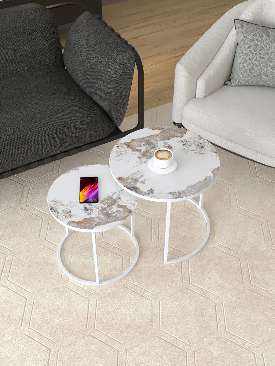 Создайте неповторимую атмосферу уюта с помощью этого замечательного круглый журнальный столик. Этот стильный комплект включает два стола: большой диаметром 50 см и высотой 45 см, а также малый диаметром 40 см и высотой 40 см. Универсальный приставной столик станет идеальным дополнением к любому дивану или креслу. Изысканная керамогранитная поверхность поражает своей красотой. Как кофейный столик, он создаст уютную атмосферу для утреннего кофе или вечернего чая. Вы можете выбрать из 24 вариантов цветовых решений, что позволит идеально вписать столики в ваш интерьер. Порадуйте себя покупкой, которая изменит ваш дом к лучшему!