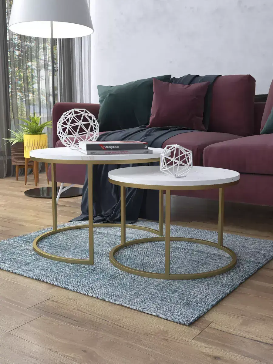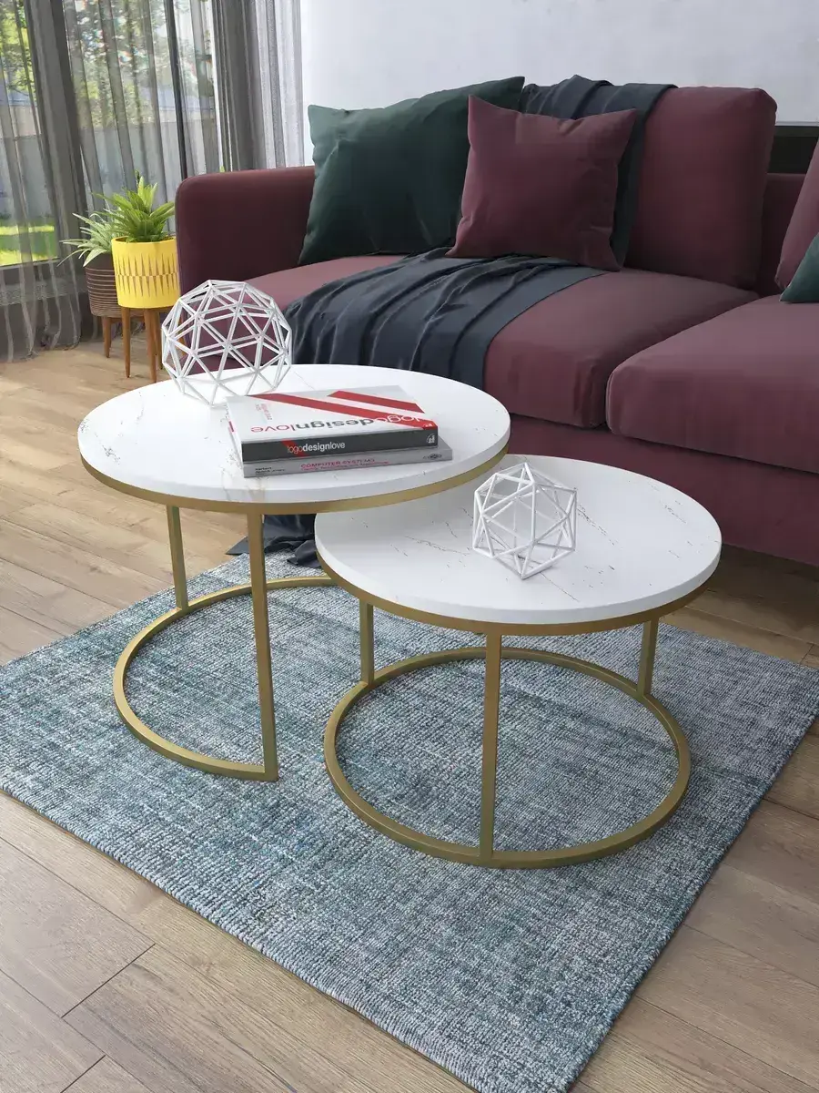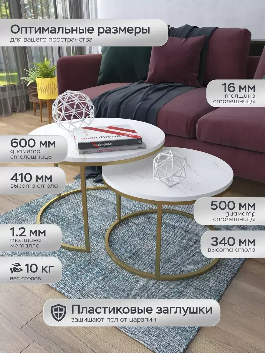 Пара журнальных столов "Акцент" — это стильное и функциональное дополнение к вашему интерьеру. Его уникальный дизайн и высокое качество сразу привлекают внимание. Столешницы влагостойкие, а основания покрыты прочной полимерно-порошковой краской. Благодаря этому они не только привлекательно выглядят, но и очень практичны. Конструкция столиков надёжна, они выдерживают нагрузку на столешницу до 30 кг. Это позволяет разместить на них различные предметы декора или напитки. Высота большего стола 41см, диаметр - 60см; высота малого столика - 34см, диаметр - 50см. Цвет основания: золото, столешницы: мрамор золото белый матовый. Основание выполнено из квадратной профильной трубы 15х15 толщиной 1.2мм Эти журнальные столики удобны в использовании. Они не царапают пол и не шатаются, обеспечивая дополнительный комфорт при эксплуатации. Производство в России гарантирует высокое качество товара и его соответствие всем стандартам. Кроме того, столики поставляются уже собранными. Вам не придётся тратить время и силы на их сборку. Просто распакуйте и наслаждайтесь преимуществами этих прекрасных изделий. Круглые журнальные столики со столешницей под мрамор — это не просто мебель. Это настоящее произведение искусства, которое подчеркнёт ваш вкус и станет главным акцентом в вашем доме. Покупая эти столики, вы получаете не только функциональную мебель, но и предмет декора, который добавит шарма и уюта в ваше пространство. Не упустите возможность купить эти уникальные журнальные столики и создать уютный уголок в вашем доме,на радость каждый день.