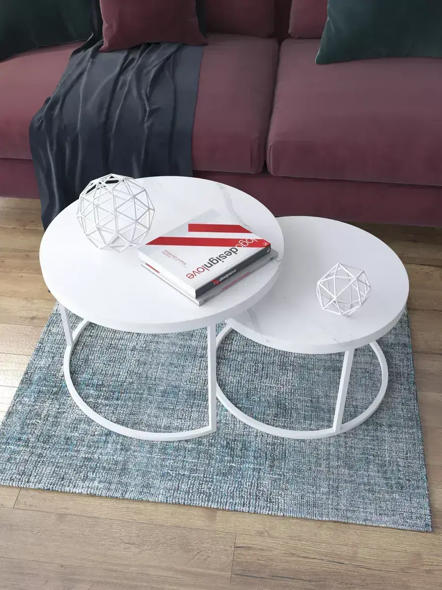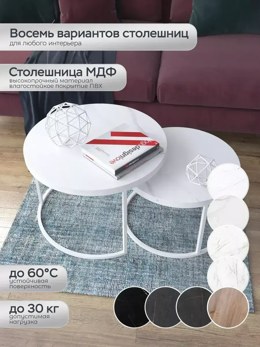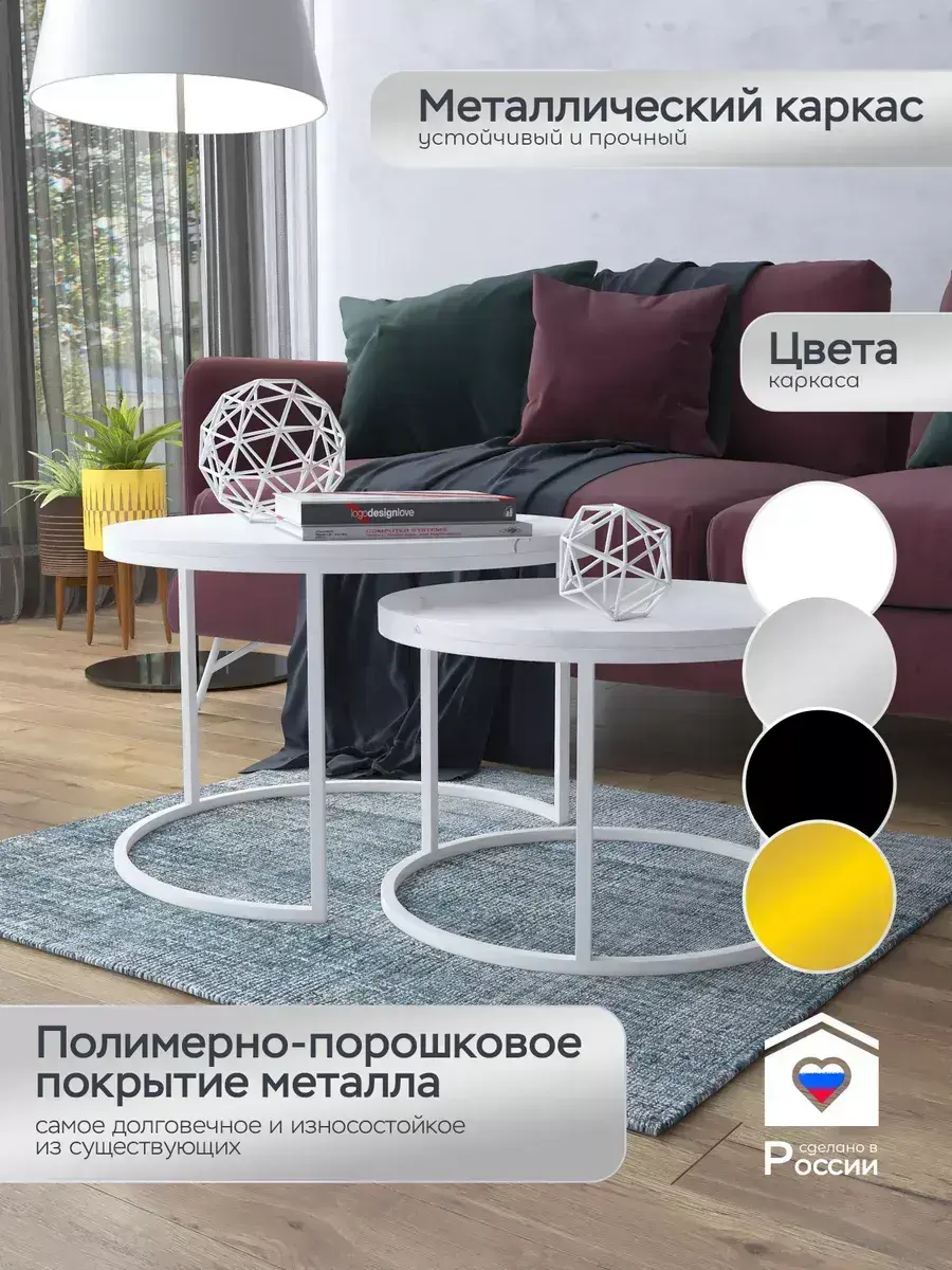 Пара журнальных столов "Акцент" — это стильное и функциональное дополнение к вашему интерьеру. Его уникальный дизайн и высокое качество сразу привлекают внимание. Столешницы влагостойкие, а основания покрыты прочной полимерно-порошковой краской. Благодаря этому они не только привлекательно выглядят, но и очень практичны. Конструкция столиков надёжна, они выдерживают нагрузку на столешницу до 30 кг. Это позволяет разместить на них различные предметы декора или напитки. Высота большего стола 41см, диаметр - 60см; высота малого столика - 34см, диаметр - 50см. Цвет основания: белый, столешницы: мрамор белый матовый. Основание выполнено из квадратной профильной трубы 15х15 толщиной 1.2мм Эти журнальные столики удобны в использовании. Они не царапают пол и не шатаются, обеспечивая дополнительный комфорт при эксплуатации. Производство в России гарантирует высокое качество товара и его соответствие всем стандартам. Кроме того, столики поставляются уже собранными. Вам не придётся тратить время и силы на их сборку. Просто распакуйте и наслаждайтесь преимуществами этих прекрасных изделий. Круглые журнальные столики со столешницей под мрамор — это не просто мебель. Это настоящее произведение искусства, которое подчеркнёт ваш вкус и станет главным акцентом в вашем доме. Покупая эти столики, вы получаете не только функциональную мебель, но и предмет декора, который добавит шарма и уюта в ваше пространство. Не упустите возможность купить эти уникальные журнальные столики и создать уютный уголок в вашем доме,на радость каждый день.