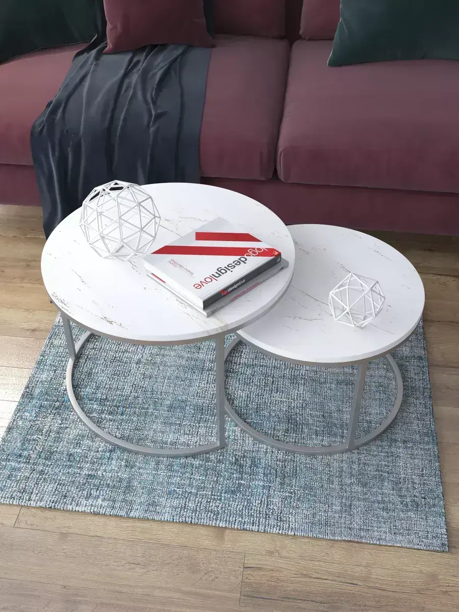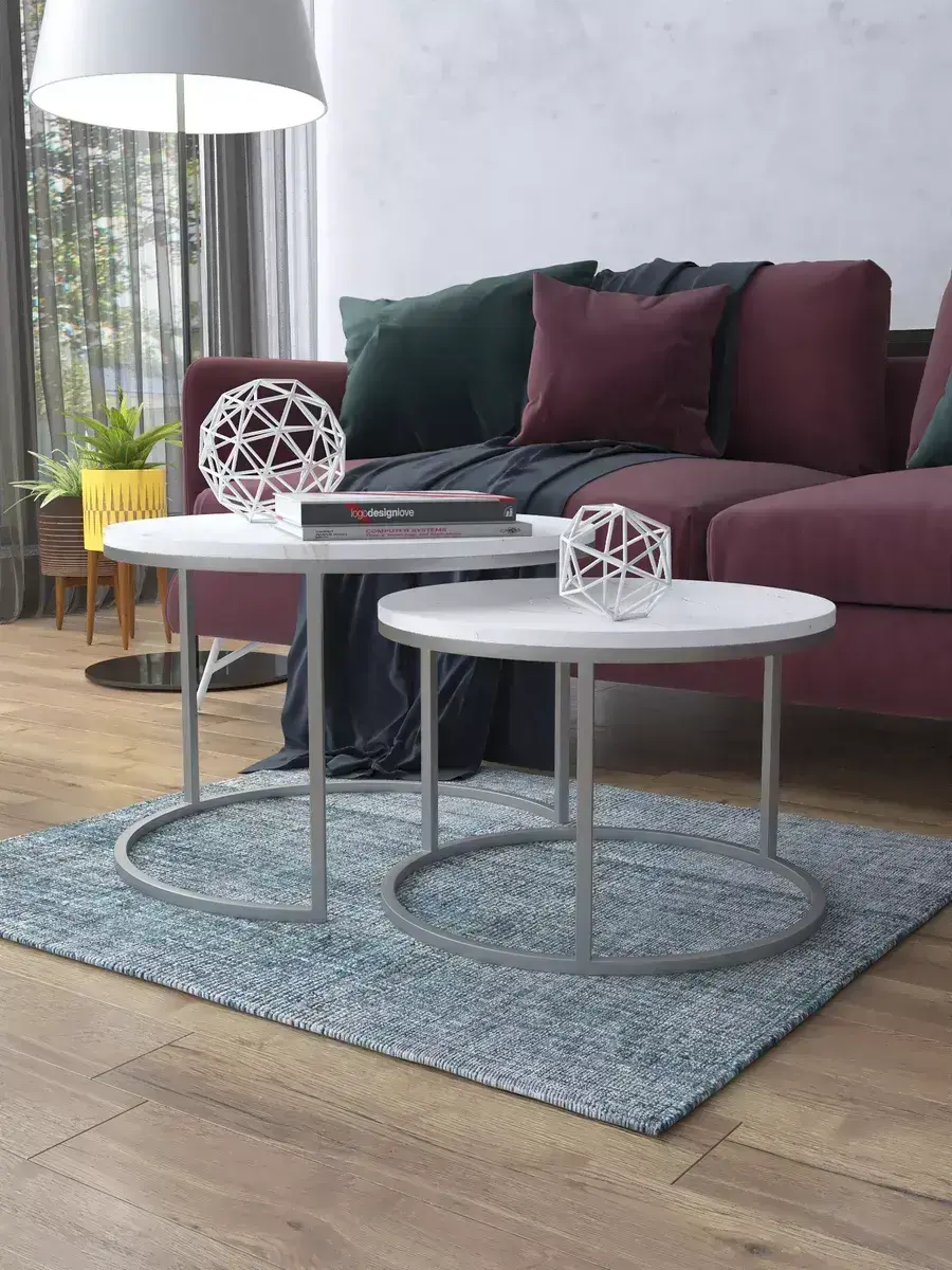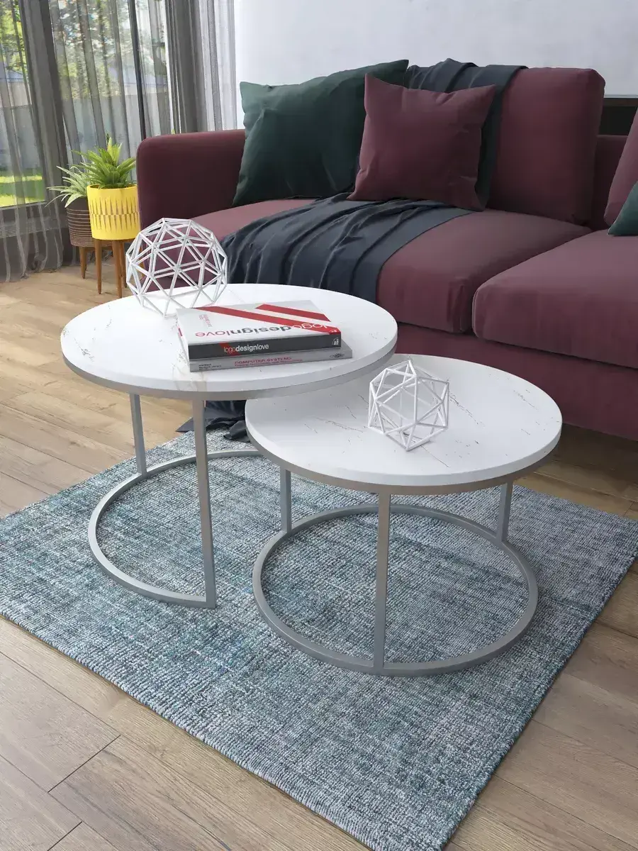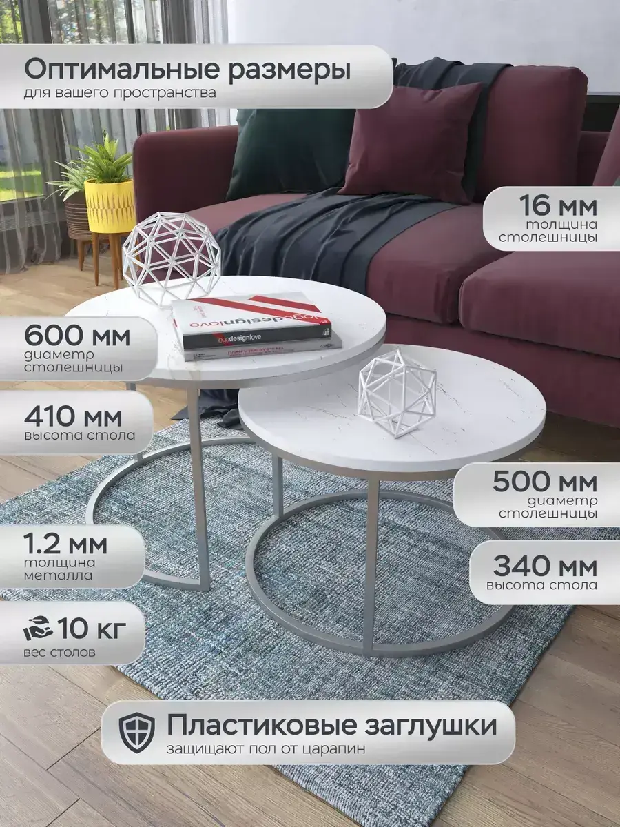 Пара журнальных столов "Акцент" — это стильное и функциональное дополнение к вашему интерьеру. Его уникальный дизайн и высокое качество сразу привлекают внимание. Столешницы влагостойкие, а основания покрыты прочной полимерно-порошковой краской. Благодаря этому они не только привлекательно выглядят, но и очень практичны. Конструкция столиков надёжна, они выдерживают нагрузку на столешницу до 30 кг. Это позволяет разместить на них различные предметы декора или напитки. Высота большего стола 41см, диаметр - 60см; высота малого столика - 34см, диаметр - 50см. Цвет основания: серебро, столешницы: мрамор золото белый матовый. Основание выполнено из квадратной профильной трубы 15х15 толщиной 1.2мм Эти журнальные столики удобны в использовании. Они не царапают пол и не шатаются, обеспечивая дополнительный комфорт при эксплуатации. Производство в России гарантирует высокое качество товара и его соответствие всем стандартам. Кроме того, столики поставляются уже собранными. Вам не придётся тратить время и силы на их сборку. Просто распакуйте и наслаждайтесь преимуществами этих прекрасных изделий. Круглые журнальные столики со столешницей под мрамор — это не просто мебель. Это настоящее произведение искусства, которое подчеркнёт ваш вкус и станет главным акцентом в вашем доме. Покупая эти столики, вы получаете не только функциональную мебель, но и предмет декора, который добавит шарма и уюта в ваше пространство. Не упустите возможность купить эти уникальные журнальные столики и создать уютный уголок в вашем доме,на радость каждый день.