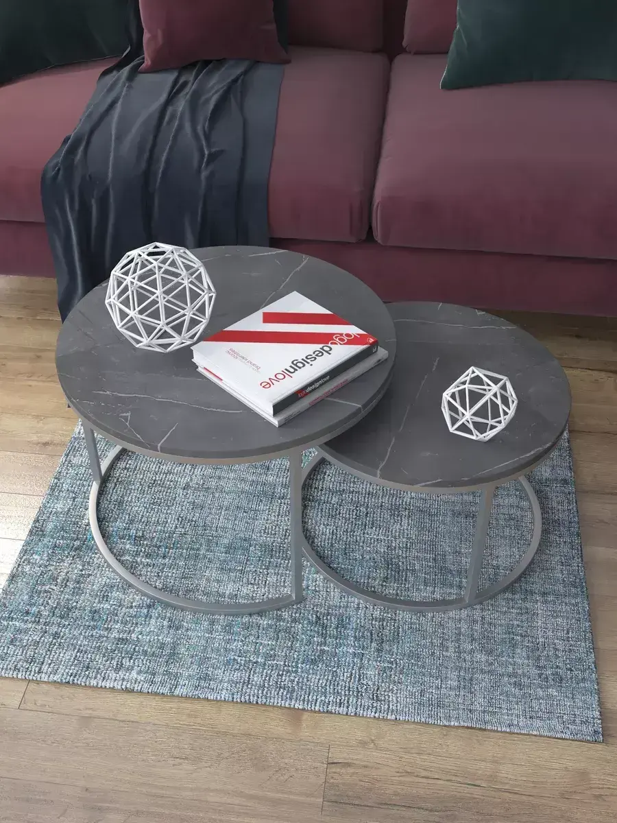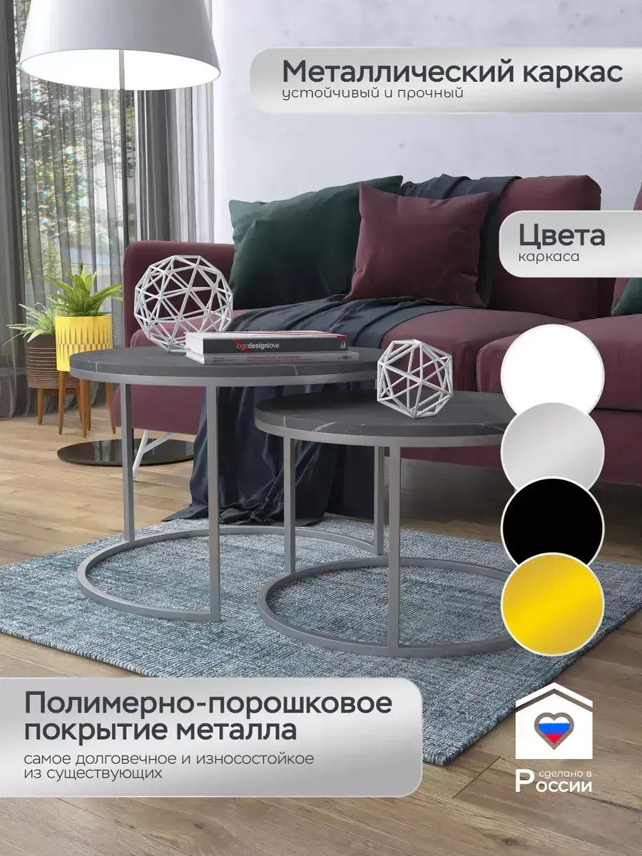 Пара журнальных столов "Акцент" — это стильное и функциональное дополнение к вашему интерьеру. Его уникальный дизайн и высокое качество сразу привлекают внимание. Столешницы влагостойкие, а основания покрыты прочной полимерно-порошковой краской. Благодаря этому они не только привлекательно выглядят, но и очень практичны. Конструкция столиков надёжна, они выдерживают нагрузку на столешницу до 30 кг. Это позволяет разместить на них различные предметы декора или напитки. Высота большего стола 41см, диаметр - 60см; высота малого столика - 34см, диаметр - 50см. Цвет основания: серебро, столешницы: мрамор серебро черный матовый. Основание выполнено из квадратной профильной трубы 15х15 толщиной 1.2мм Эти журнальные столики удобны в использовании. Они не царапают пол и не шатаются, обеспечивая дополнительный комфорт при эксплуатации. Производство в России гарантирует высокое качество товара и его соответствие всем стандартам. Кроме того, столики поставляются уже собранными. Вам не придётся тратить время и силы на их сборку. Просто распакуйте и наслаждайтесь преимуществами этих прекрасных изделий. Круглые журнальные столики со столешницей под мрамор — это не просто мебель. Это настоящее произведение искусства, которое подчеркнёт ваш вкус и станет главным акцентом в вашем доме. Покупая эти столики, вы получаете не только функциональную мебель, но и предмет декора, который добавит шарма и уюта в ваше пространство. Не упустите возможность купить эти уникальные журнальные столики и создать уютный уголок в вашем доме,на радость каждый день.