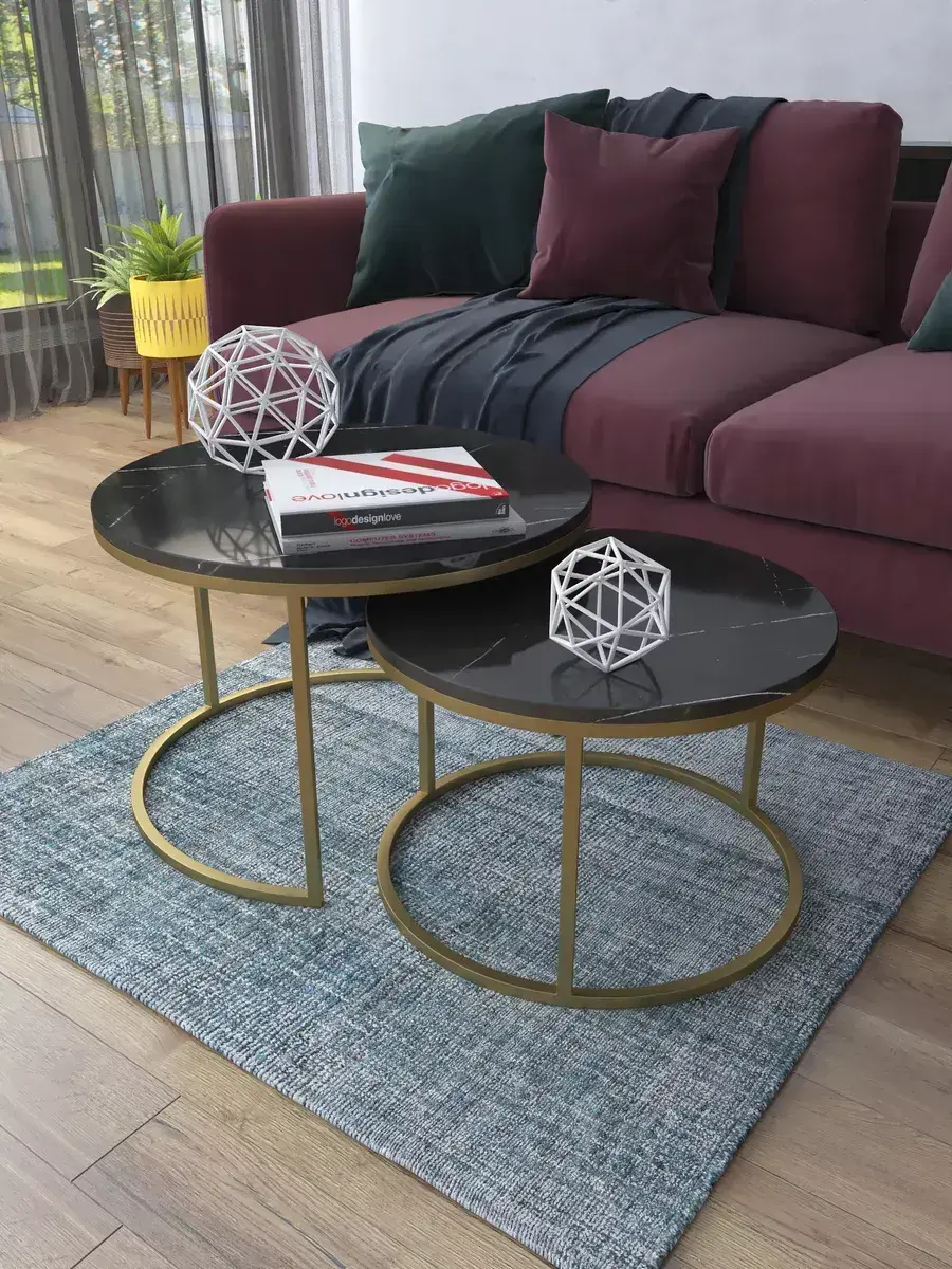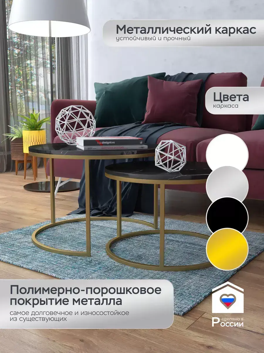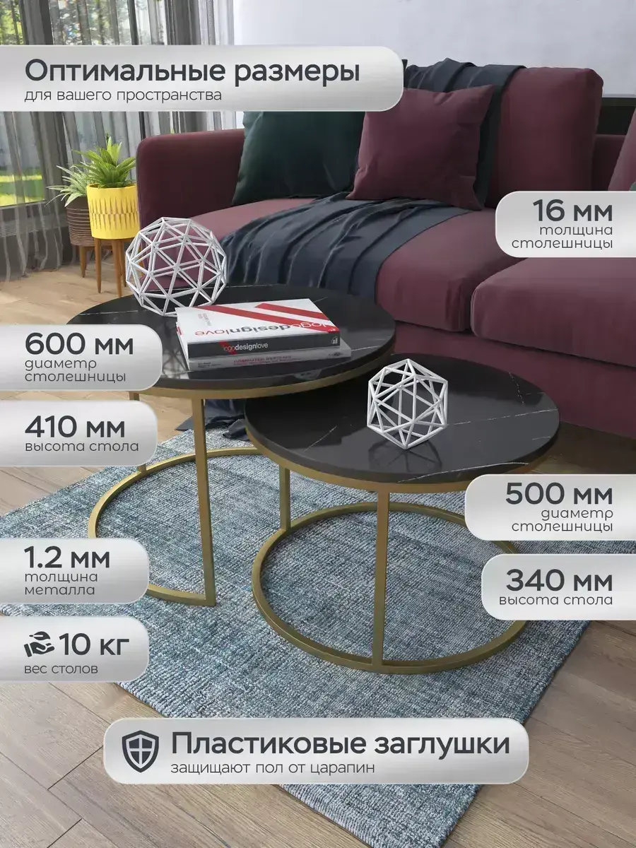 Пара журнальных столов "Акцент" — это стильное и функциональное дополнение к вашему интерьеру. Его уникальный дизайн и высокое качество сразу привлекают внимание. Столешницы влагостойкие, а основания покрыты прочной полимерно-порошковой краской. Благодаря этому они не только привлекательно выглядят, но и очень практичны. Конструкция столиков надёжна, они выдерживают нагрузку на столешницу до 30 кг. Это позволяет разместить на них различные предметы декора или напитки. Высота большего стола 41см, диаметр - 60см; высота малого столика - 34см, диаметр - 50см. Цвет основания: золото, столешницы: мрамор черный глянцевый. Основание выполнено из квадратной профильной трубы 15х15 толщиной 1.2мм Эти журнальные столики удобны в использовании. Они не царапают пол и не шатаются, обеспечивая дополнительный комфорт при эксплуатации. Производство в России гарантирует высокое качество товара и его соответствие всем стандартам. Кроме того, столики поставляются уже собранными. Вам не придётся тратить время и силы на их сборку. Просто распакуйте и наслаждайтесь преимуществами этих прекрасных изделий. Круглые журнальные столики со столешницей под мрамор — это не просто мебель. Это настоящее произведение искусства, которое подчеркнёт ваш вкус и станет главным акцентом в вашем доме. Покупая эти столики, вы получаете не только функциональную мебель, но и предмет декора, который добавит шарма и уюта в ваше пространство. Не упустите возможность купить эти уникальные журнальные столики и создать уютный уголок в вашем доме,на радость каждый день.