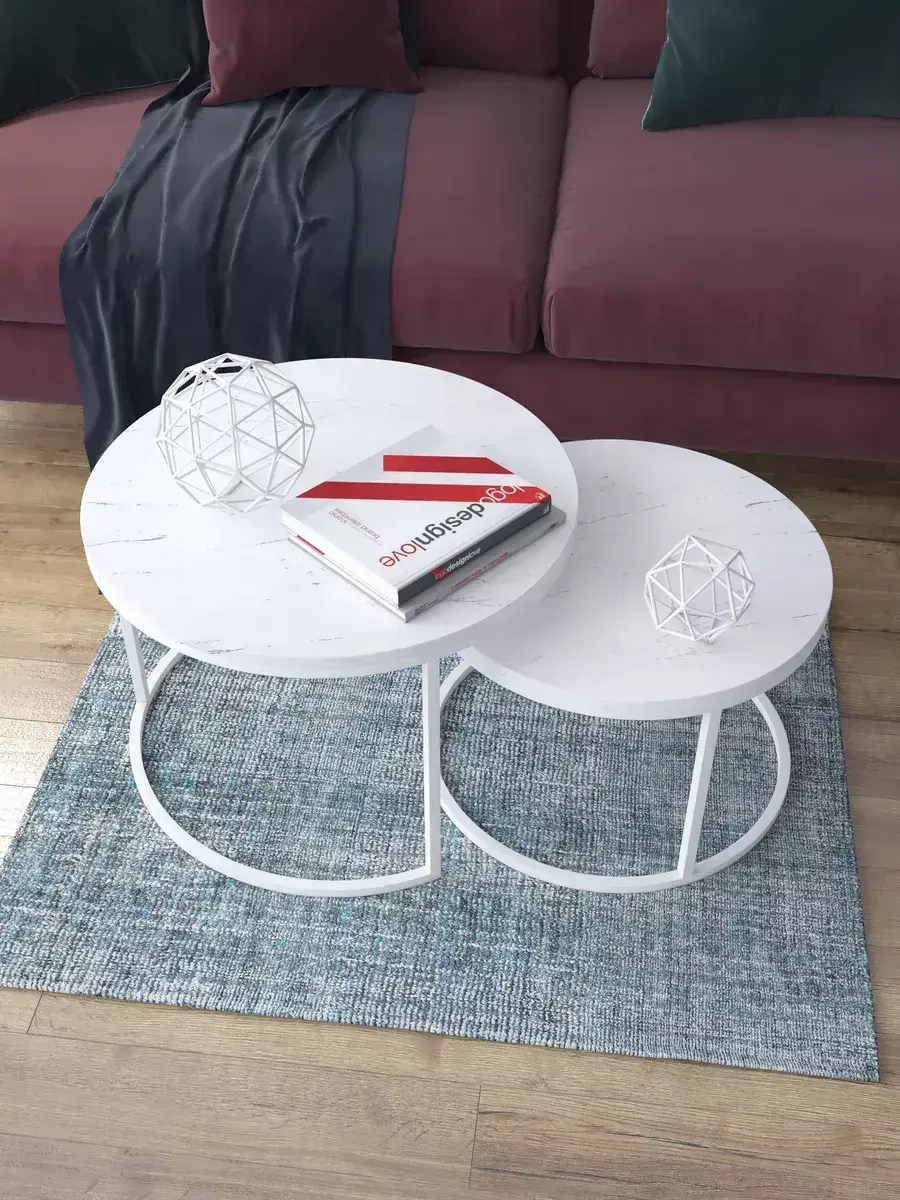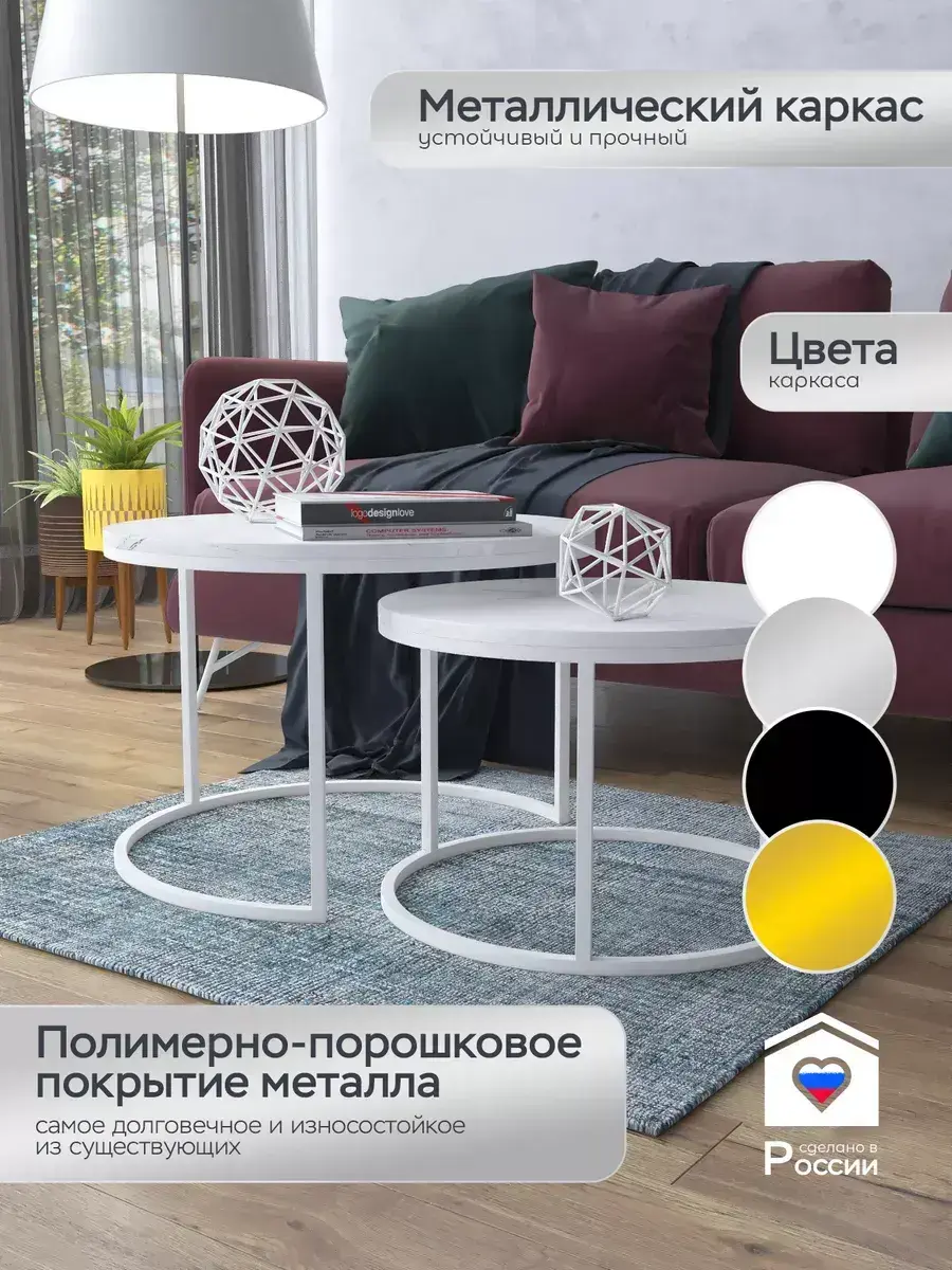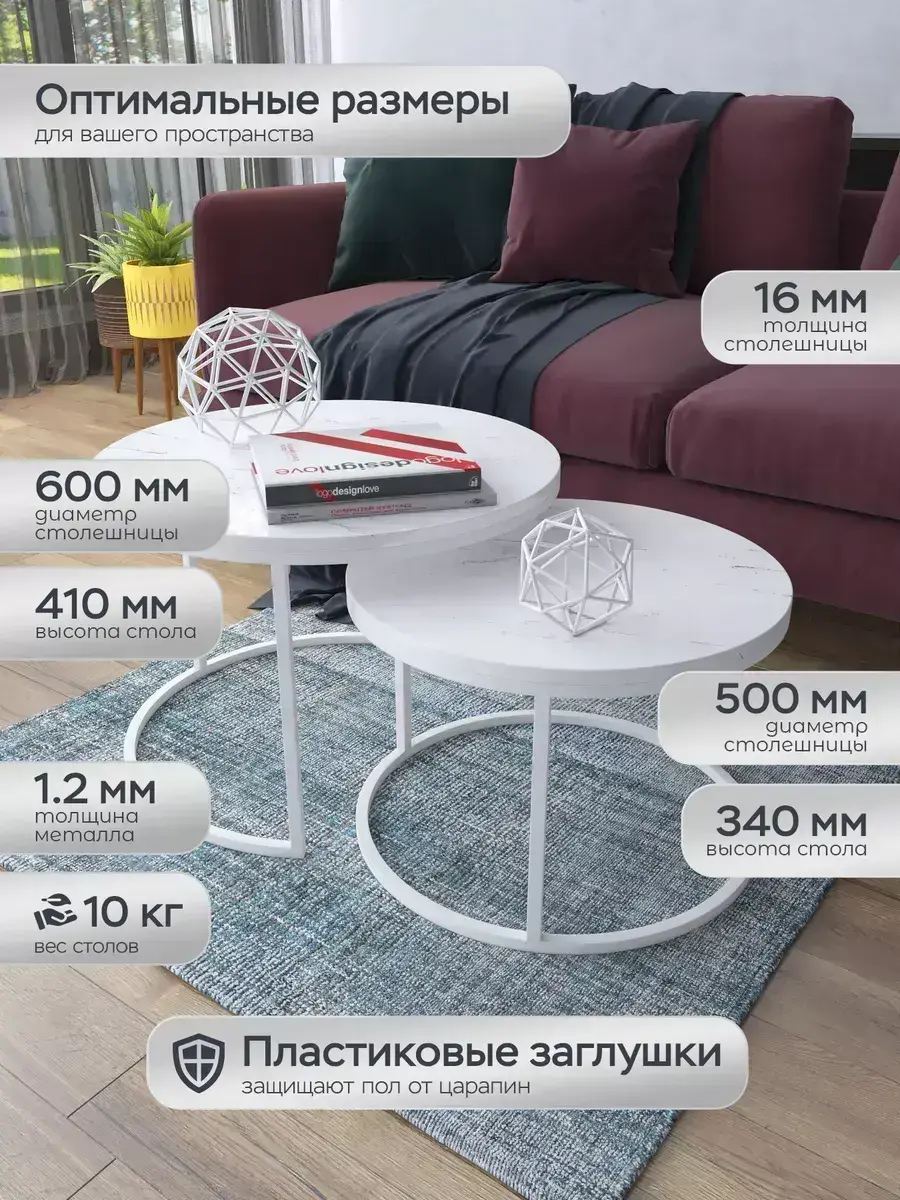 Пара журнальных столов "Акцент" — это стильное и функциональное дополнение к вашему интерьеру. Его уникальный дизайн и высокое качество сразу привлекают внимание. Столешницы влагостойкие, а основания покрыты прочной полимерно-порошковой краской. Благодаря этому они не только привлекательно выглядят, но и очень практичны. Конструкция столиков надёжна, они выдерживают нагрузку на столешницу до 30 кг. Это позволяет разместить на них различные предметы декора или напитки. Высота большего стола 41см, диаметр - 60см; высота малого столика - 34см, диаметр - 50см. Цвет основания: белый, столешницы: мрамор серебро белый глянцевый. Основание выполнено из квадратной профильной трубы 15х15 толщиной 1.2мм Эти журнальные столики удобны в использовании. Они не царапают пол и не шатаются, обеспечивая дополнительный комфорт при эксплуатации. Производство в России гарантирует высокое качество товара и его соответствие всем стандартам. Кроме того, столики поставляются уже собранными. Вам не придётся тратить время и силы на их сборку. Просто распакуйте и наслаждайтесь преимуществами этих прекрасных изделий. Круглые журнальные столики со столешницей под мрамор — это не просто мебель. Это настоящее произведение искусства, которое подчеркнёт ваш вкус и станет главным акцентом в вашем доме. Покупая эти столики, вы получаете не только функциональную мебель, но и предмет декора, который добавит шарма и уюта в ваше пространство. Не упустите возможность купить эти уникальные журнальные столики и создать уютный уголок в вашем доме,на радость каждый день.