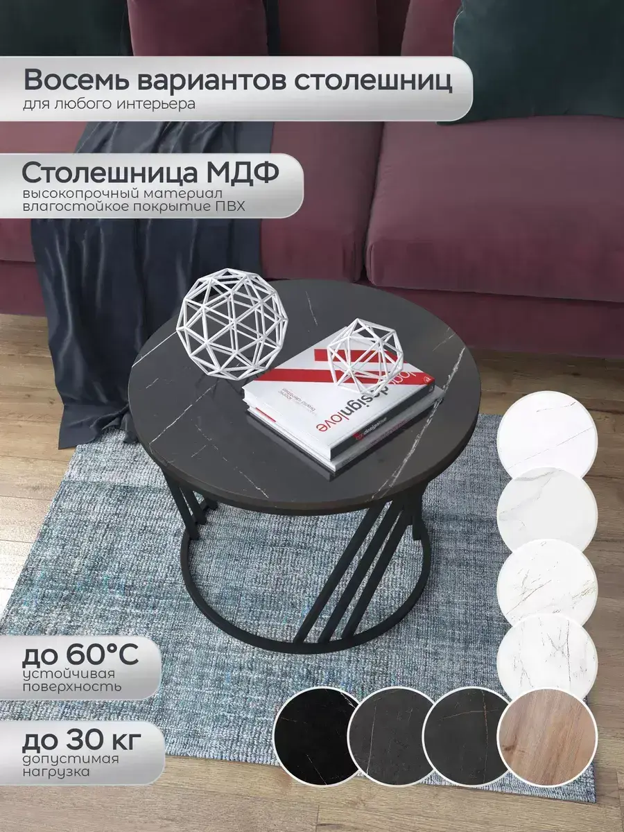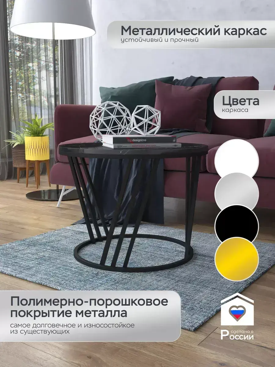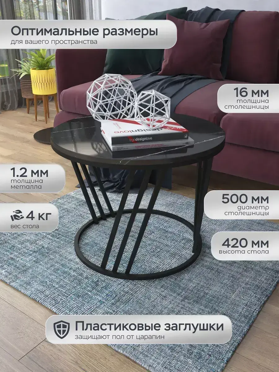 Журнальный стол "Адидас" — это стильное и функциональное дополнение к вашему интерьеру. Его уникальный дизайн и высокое качество сразу привлекают внимание. Столешница влагостойкая, а основание покрыто прочной полимерно-порошковой краской. Благодаря этому он не только привлекательно выглядит, но и очень практичен. Конструкция столика надёжна, он выдерживает нагрузку на столешницу до 30 кг. Это позволяет разместить на нём различные предметы декора или напитки. Цвет основания: черный, столешницы: мрамор черный глянцевый. Основание выполнено из квадратной профильной трубы 15х15 толщиной 1.2мм Этот журнальный столик удобен в использовании. Он не царапает пол и не шатается, обеспечивая дополнительный комфорт при эксплуатации. Производство в России гарантирует высокое качество товара и его соответствие всем стандартам. Кроме того, столик поставляется уже собранным. Вам не придётся тратить время и силы на его сборку. Просто распакуйте его и наслаждайтесь преимуществами этого прекрасного изделия. Круглый журнальный столик со столешницей под мрамор — это не просто мебель. Это настоящее произведение искусства, которое подчеркнёт ваш вкус и станет главным акцентом в вашем доме. Покупая этот столик, вы получаете не только функциональную мебель, но и предмет декора, который добавит шарма и уюта в ваше пространство. Не упустите возможность купить этот уникальный журнальный столик и создать уютный уголок в вашем доме, который будет радовать вас каждый день.