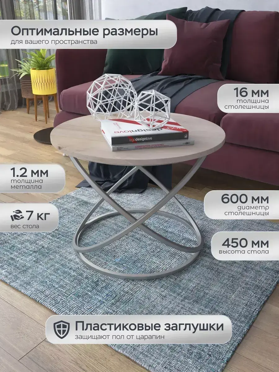 Журнальный стол "Инфинити" — это стильное и функциональное дополнение к вашему интерьеру. Его уникальный дизайн и высокое качество сразу привлекают внимание. Столешница влагостойкая, а основание покрыто прочной полимерно-порошковой краской. Благодаря этому он не только привлекательно выглядит, но и очень практичен. Конструкция столика надёжна, он выдерживает нагрузку на столешницу до 30 кг. Это позволяет разместить на нём различные предметы декора или напитки. Цвет основания: серебро, столешницы: дуб натуральный. Основание выполнено из квадратной профильной трубы 15х15 толщиной 1.2мм Этот журнальный столик удобен в использовании. Он не царапает пол и не шатается, обеспечивая дополнительный комфорт при эксплуатации. Производство в России гарантирует высокое качество товара и его соответствие всем стандартам. Кроме того, столик поставляется уже собранным. Вам не придётся тратить время и силы на его сборку. Просто распакуйте его и наслаждайтесь преимуществами этого прекрасного изделия. Круглый журнальный столик со столешницей под мрамор — это не просто мебель. Это настоящее произведение искусства, которое подчеркнёт ваш вкус и станет главным акцентом в вашем доме. Покупая этот столик, вы получаете не только функциональную мебель, но и предмет декора, который добавит шарма и уюта в ваше пространство. Не упустите возможность купить этот уникальный журнальный столик и создать уютный уголок в вашем доме, который будет радовать вас каждый день.