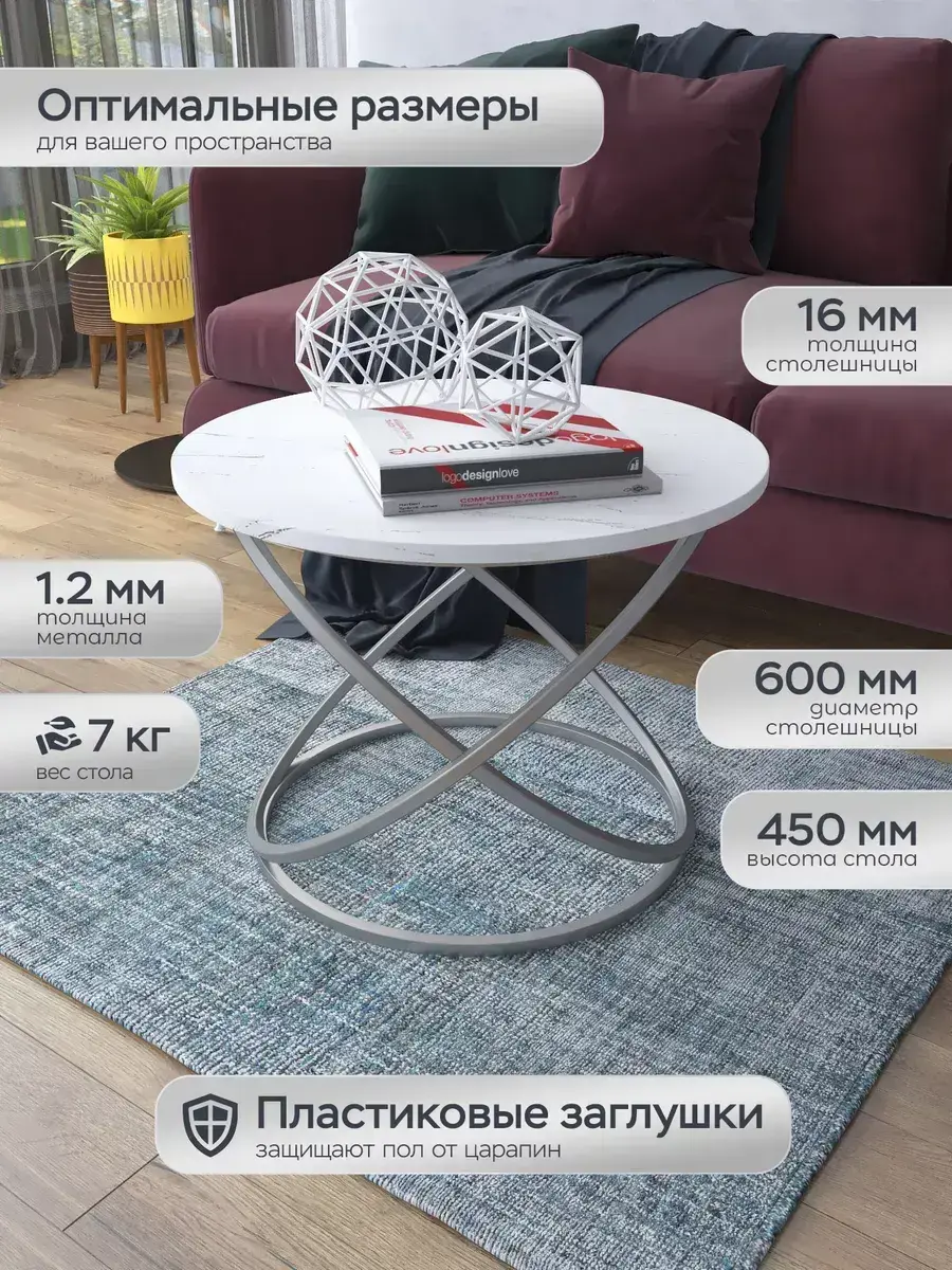 Журнальный стол "Инфинити" — это стильное и функциональное дополнение к вашему интерьеру. Его уникальный дизайн и высокое качество сразу привлекают внимание. Столешница влагостойкая, а основание покрыто прочной полимерно-порошковой краской. Благодаря этому он не только привлекательно выглядит, но и очень практичен. Конструкция столика надёжна, он выдерживает нагрузку на столешницу до 30 кг. Это позволяет разместить на нём различные предметы декора или напитки. Цвет основания: серебро, столешницы: мрамор серебро белый матовый. Основание выполнено из квадратной профильной трубы 15х15 толщиной 1.2мм Этот журнальный столик удобен в использовании. Он не царапает пол и не шатается, обеспечивая дополнительный комфорт при эксплуатации. Производство в России гарантирует высокое качество товара и его соответствие всем стандартам. Кроме того, столик поставляется уже собранным. Вам не придётся тратить время и силы на его сборку. Просто распакуйте его и наслаждайтесь преимуществами этого прекрасного изделия. Круглый журнальный столик со столешницей под мрамор — это не просто мебель. Это настоящее произведение искусства, которое подчеркнёт ваш вкус и станет главным акцентом в вашем доме. Покупая этот столик, вы получаете не только функциональную мебель, но и предмет декора, который добавит шарма и уюта в ваше пространство. Не упустите возможность купить этот уникальный журнальный столик и создать уютный уголок в вашем доме, который будет радовать вас каждый день.