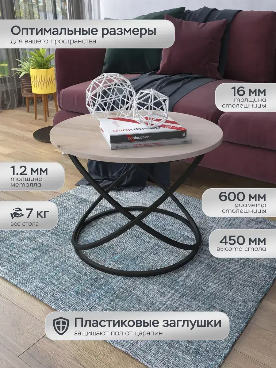 Журнальный стол "Инфинити" — это стильное и функциональное дополнение к вашему интерьеру. Его уникальный дизайн и высокое качество сразу привлекают внимание. Столешница влагостойкая, а основание покрыто прочной полимерно-порошковой краской. Благодаря этому он не только привлекательно выглядит, но и очень практичен. Конструкция столика надёжна, он выдерживает нагрузку на столешницу до 30 кг. Это позволяет разместить на нём различные предметы декора или напитки. Цвет основания: черный, столешницы: дуб натуральный. Основание выполнено из квадратной профильной трубы 15х15 толщиной 1.2мм Этот журнальный столик удобен в использовании. Он не царапает пол и не шатается, обеспечивая дополнительный комфорт при эксплуатации. Производство в России гарантирует высокое качество товара и его соответствие всем стандартам. Кроме того, столик поставляется уже собранным. Вам не придётся тратить время и силы на его сборку. Просто распакуйте его и наслаждайтесь преимуществами этого прекрасного изделия. Круглый журнальный столик со столешницей под мрамор — это не просто мебель. Это настоящее произведение искусства, которое подчеркнёт ваш вкус и станет главным акцентом в вашем доме. Покупая этот столик, вы получаете не только функциональную мебель, но и предмет декора, который добавит шарма и уюта в ваше пространство. Не упустите возможность купить этот уникальный журнальный столик и создать уютный уголок в вашем доме, который будет радовать вас каждый день.