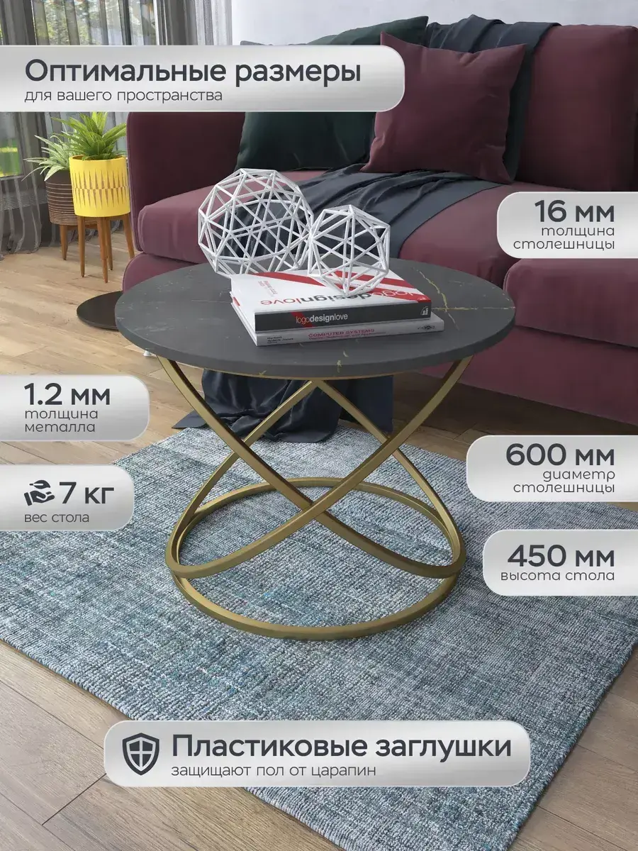 Журнальный стол "Инфинити" — это стильное и функциональное дополнение к вашему интерьеру. Его уникальный дизайн и высокое качество сразу привлекают внимание. Столешница влагостойкая, а основание покрыто прочной полимерно-порошковой краской. Благодаря этому он не только привлекательно выглядит, но и очень практичен. Конструкция столика надёжна, он выдерживает нагрузку на столешницу до 30 кг. Это позволяет разместить на нём различные предметы декора или напитки. Цвет основания: золото, столешницы: мрамор золото черный матовый. Основание выполнено из квадратной профильной трубы 15х15 толщиной 1.2мм Этот журнальный столик удобен в использовании. Он не царапает пол и не шатается, обеспечивая дополнительный комфорт при эксплуатации. Производство в России гарантирует высокое качество товара и его соответствие всем стандартам. Кроме того, столик поставляется уже собранным. Вам не придётся тратить время и силы на его сборку. Просто распакуйте его и наслаждайтесь преимуществами этого прекрасного изделия. Круглый журнальный столик со столешницей под мрамор — это не просто мебель. Это настоящее произведение искусства, которое подчеркнёт ваш вкус и станет главным акцентом в вашем доме. Покупая этот столик, вы получаете не только функциональную мебель, но и предмет декора, который добавит шарма и уюта в ваше пространство. Не упустите возможность купить этот уникальный журнальный столик и создать уютный уголок в вашем доме, который будет радовать вас каждый день.