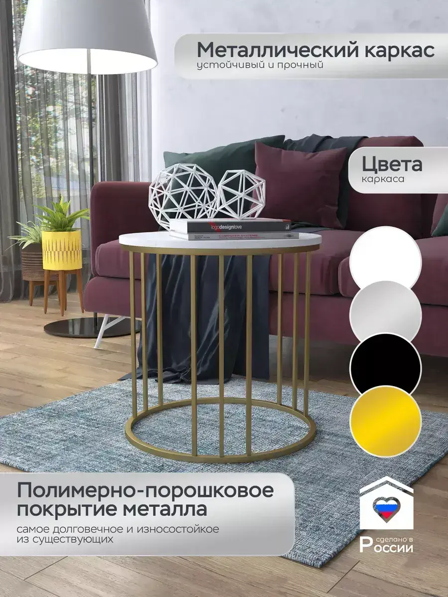 Журнальный стол "Трио малый" — это стильное и функциональное дополнение к вашему интерьеру. Его уникальный дизайн и высокое качество сразу привлекают внимание. Столешница влагостойкая, а основание покрыто прочной полимерно-порошковой краской. Благодаря этому он не только привлекательно выглядит, но и очень практичен. Конструкция столика надёжна, он выдерживает нагрузку на столешницу до 30 кг. Это позволяет разместить на нём различные предметы декора или напитки. Цвет основания: золото, столешницы: мрамор белый глянцевый. Основание выполнено из квадратной профильной трубы 15х15 толщиной 1.2мм Этот журнальный столик удобен в использовании. Он не царапает пол и не шатается, обеспечивая дополнительный комфорт при эксплуатации. Производство в России гарантирует высокое качество товара и его соответствие всем стандартам. Кроме того, столик поставляется уже собранным. Вам не придётся тратить время и силы на его сборку. Просто распакуйте его и наслаждайтесь преимуществами этого прекрасного изделия. Круглый журнальный столик со столешницей под мрамор — это не просто мебель. Это настоящее произведение искусства, которое подчеркнёт ваш вкус и станет главным акцентом в вашем доме. Покупая этот столик, вы получаете не только функциональную мебель, но и предмет декора, который добавит шарма и уюта в ваше пространство. Не упустите возможность купить этот уникальный журнальный столик и создать уютный уголок в вашем доме, который будет радовать вас каждый день.