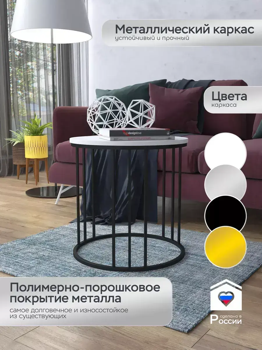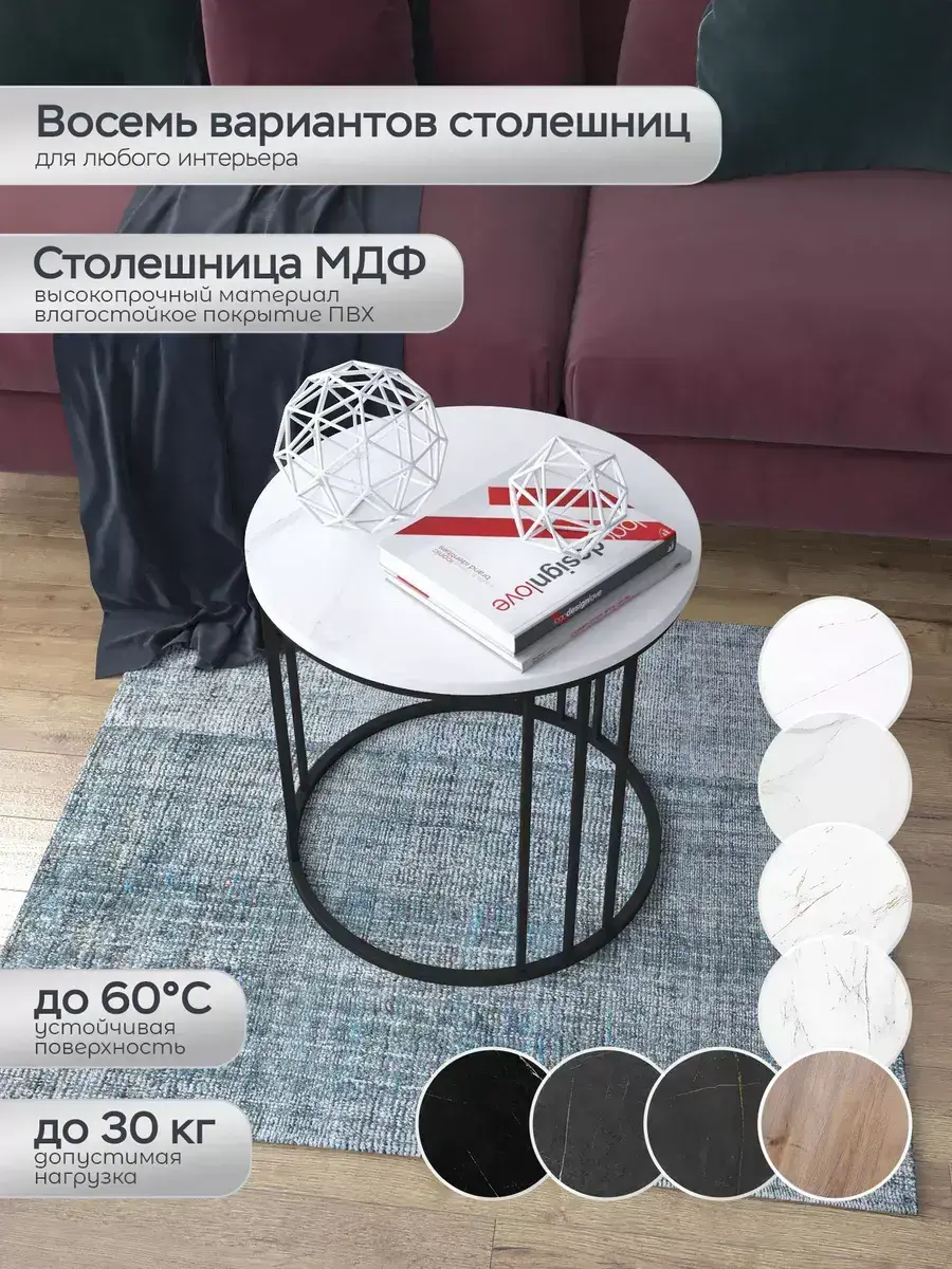 Журнальный стол "Трио малый" — это стильное и функциональное дополнение к вашему интерьеру. Его уникальный дизайн и высокое качество сразу привлекают внимание. Столешница влагостойкая, а основание покрыто прочной полимерно-порошковой краской. Благодаря этому он не только привлекательно выглядит, но и очень практичен. Конструкция столика надёжна, он выдерживает нагрузку на столешницу до 30 кг. Это позволяет разместить на нём различные предметы декора или напитки. Цвет основания: черный, столешницы: мрамор белый матовый. Основание выполнено из квадратной профильной трубы 15х15 толщиной 1.2мм Этот журнальный столик удобен в использовании. Он не царапает пол и не шатается, обеспечивая дополнительный комфорт при эксплуатации. Производство в России гарантирует высокое качество товара и его соответствие всем стандартам. Кроме того, столик поставляется уже собранным. Вам не придётся тратить время и силы на его сборку. Просто распакуйте его и наслаждайтесь преимуществами этого прекрасного изделия. Круглый журнальный столик со столешницей под мрамор — это не просто мебель. Это настоящее произведение искусства, которое подчеркнёт ваш вкус и станет главным акцентом в вашем доме. Покупая этот столик, вы получаете не только функциональную мебель, но и предмет декора, который добавит шарма и уюта в ваше пространство. Не упустите возможность купить этот уникальный журнальный столик и создать уютный уголок в вашем доме, который будет радовать вас каждый день.