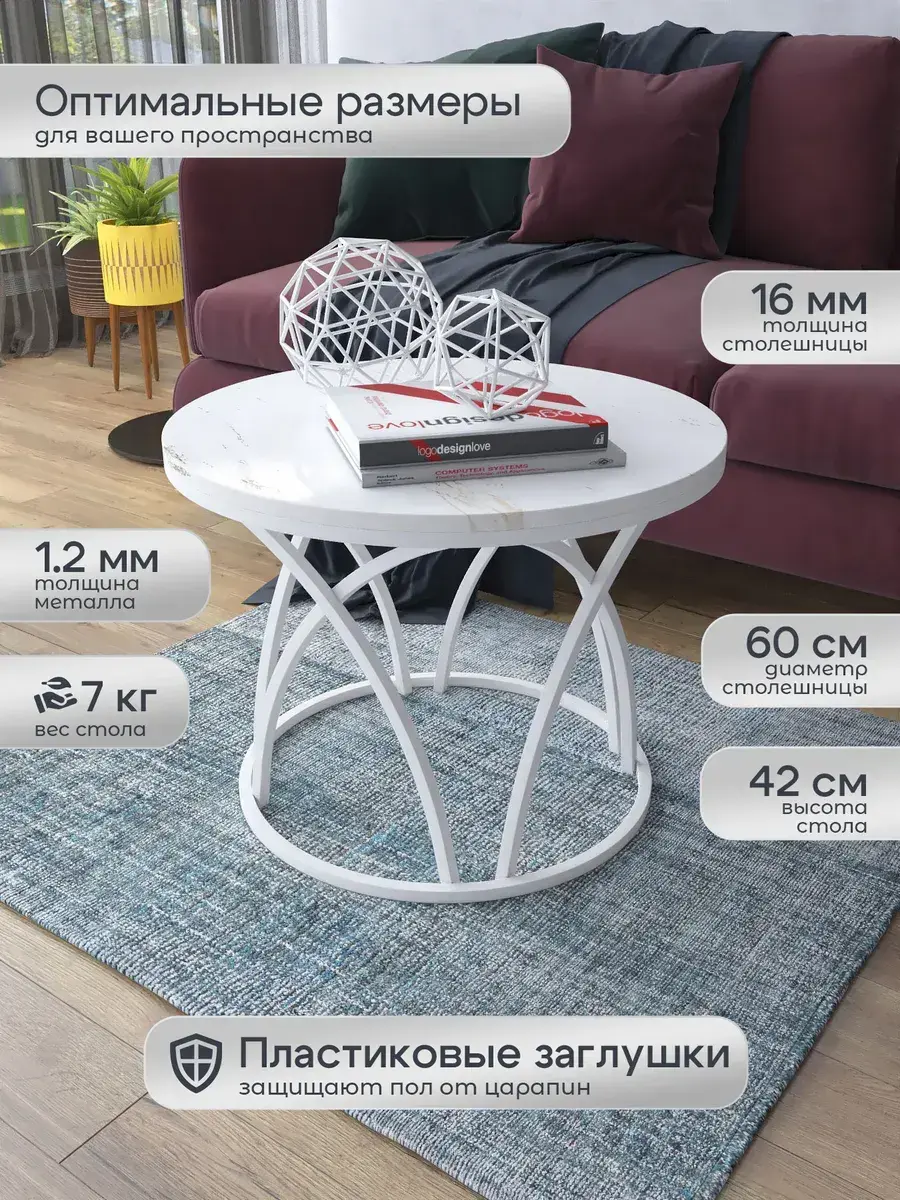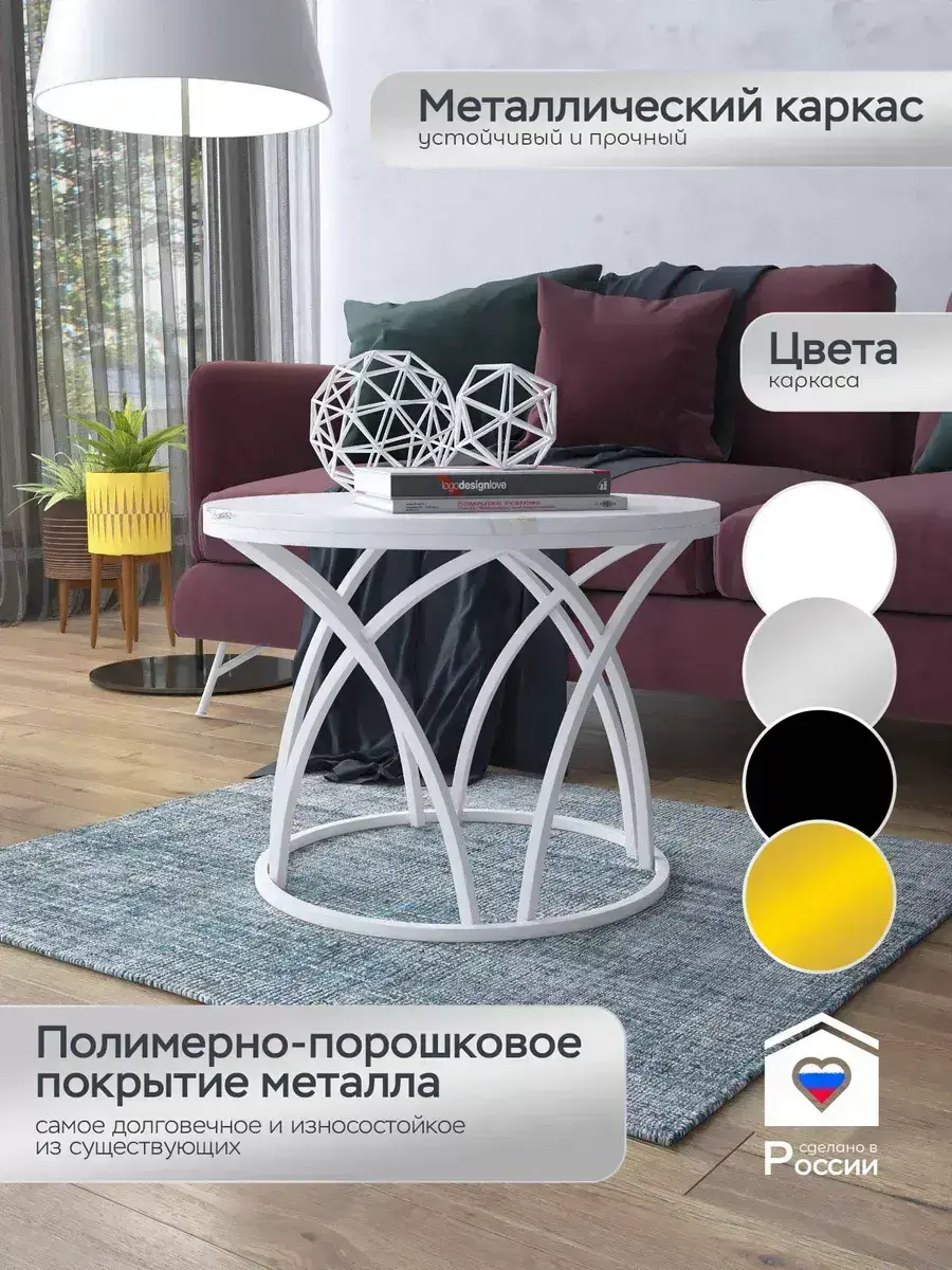 Журнальный стол "Тюльпан" — это стильное и функциональное дополнение к вашему интерьеру. Его уникальный дизайн и высокое качество сразу привлекают внимание. Столешница влагостойкая, а основание покрыто прочной полимерно-порошковой краской. Благодаря этому он не только привлекательно выглядит, но и очень практичен. Конструкция столика надёжна, он выдерживает нагрузку на столешницу до 30 кг. Это позволяет разместить на нём различные предметы декора или напитки. Цвет основания: белый, столешницы: мрамор золото белый глянцевый. Основание выполнено из квадратной профильной трубы 15х15 толщиной 1.2мм Этот журнальный столик удобен в использовании. Он не царапает пол и не шатается, обеспечивая дополнительный комфорт при эксплуатации. Производство в России гарантирует высокое качество товара и его соответствие всем стандартам. Кроме того, столик поставляется уже собранным. Вам не придётся тратить время и силы на его сборку. Просто распакуйте его и наслаждайтесь преимуществами этого прекрасного изделия. Круглый журнальный столик со столешницей под мрамор — это не просто мебель. Это настоящее произведение искусства, которое подчеркнёт ваш вкус и станет главным акцентом в вашем доме. Покупая этот столик, вы получаете не только функциональную мебель, но и предмет декора, который добавит шарма и уюта в ваше пространство. Не упустите возможность купить этот уникальный журнальный столик и создать уютный уголок в вашем доме, который будет радовать вас каждый день.