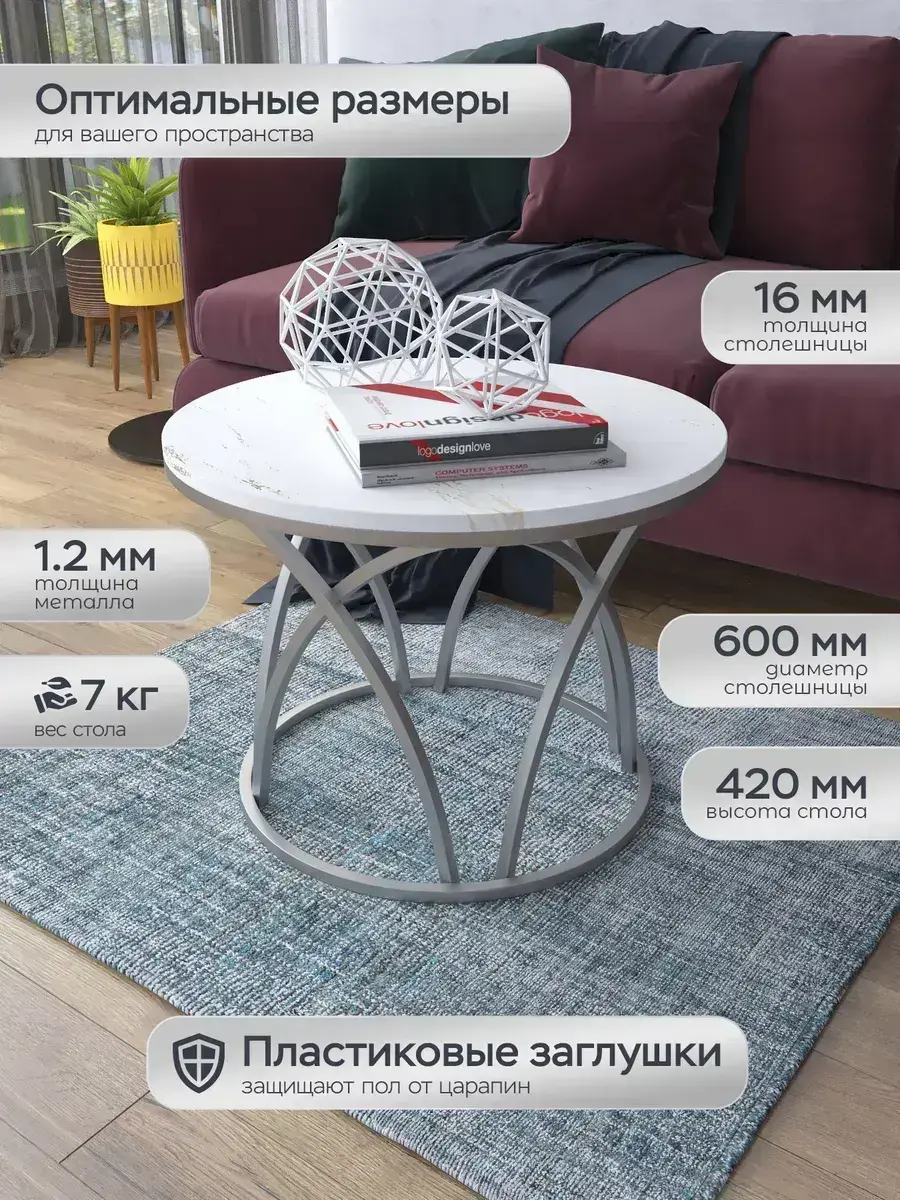 Журнальный стол "Тюльпан" — это стильное и функциональное дополнение к вашему интерьеру. Его уникальный дизайн и высокое качество сразу привлекают внимание. Столешница влагостойкая, а основание покрыто прочной полимерно-порошковой краской. Благодаря этому он не только привлекательно выглядит, но и очень практичен. Конструкция столика надёжна, он выдерживает нагрузку на столешницу до 30 кг. Это позволяет разместить на нём различные предметы декора или напитки. Цвет основания: серебро, столешницы: мрамор золото белый матовый. Основание выполнено из квадратной профильной трубы 15х15 толщиной 1.2мм Этот журнальный столик удобен в использовании. Он не царапает пол и не шатается, обеспечивая дополнительный комфорт при эксплуатации. Производство в России гарантирует высокое качество товара и его соответствие всем стандартам. Кроме того, столик поставляется уже собранным. Вам не придётся тратить время и силы на его сборку. Просто распакуйте его и наслаждайтесь преимуществами этого прекрасного изделия. Круглый журнальный столик со столешницей под мрамор — это не просто мебель. Это настоящее произведение искусства, которое подчеркнёт ваш вкус и станет главным акцентом в вашем доме. Покупая этот столик, вы получаете не только функциональную мебель, но и предмет декора, который добавит шарма и уюта в ваше пространство. Не упустите возможность купить этот уникальный журнальный столик и создать уютный уголок в вашем доме, который будет радовать вас каждый день.