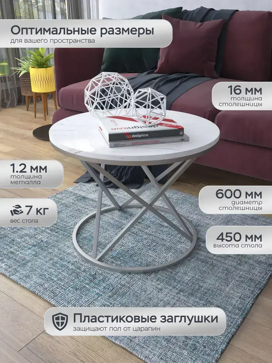 Журнальный стол "Звёздный" — это стильное и функциональное дополнение к вашему интерьеру. Его уникальный дизайн и высокое качество сразу привлекают внимание. Столешница влагостойкая, а основание покрыто прочной полимерно-порошковой краской. Благодаря этому он не только привлекательно выглядит, но и очень практичен. Конструкция столика надёжна, он выдерживает нагрузку на столешницу до 30 кг. Это позволяет разместить на нём различные предметы декора или напитки. Цвет основания: серебро, столешницы: мрамор серебро белый глянцевый. Основание выполнено из квадратной профильной трубы 15х15 толщиной 1.2мм Этот журнальный столик удобен в использовании. Он не царапает пол и не шатается, обеспечивая дополнительный комфорт при эксплуатации. Производство в России гарантирует высокое качество товара и его соответствие всем стандартам. Кроме того, столик поставляется уже собранным. Вам не придётся тратить время и силы на его сборку. Просто распакуйте его и наслаждайтесь преимуществами этого прекрасного изделия. Круглый журнальный столик со столешницей под мрамор — это не просто мебель. Это настоящее произведение искусства, которое подчеркнёт ваш вкус и станет главным акцентом в вашем доме. Покупая этот столик, вы получаете не только функциональную мебель, но и предмет декора, который добавит шарма и уюта в ваше пространство. Не упустите возможность купить этот уникальный журнальный столик и создать уютный уголок в вашем доме, который будет радовать вас каждый день.