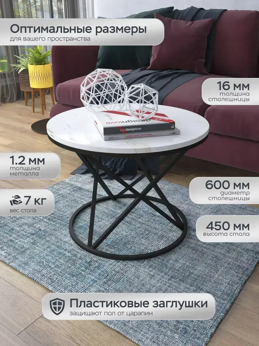 Журнальный стол "Звёздный" — это стильное и функциональное дополнение к вашему интерьеру. Его уникальный дизайн и высокое качество сразу привлекают внимание. Столешница влагостойкая, а основание покрыто прочной полимерно-порошковой краской. Благодаря этому он не только привлекательно выглядит, но и очень практичен. Конструкция столика надёжна, он выдерживает нагрузку на столешницу до 30 кг. Это позволяет разместить на нём различные предметы декора или напитки. Цвет основания: черный, столешницы: мрамор золото белый глянцевый. Основание выполнено из квадратной профильной трубы 15х15 толщиной 1.2мм Этот журнальный столик удобен в использовании. Он не царапает пол и не шатается, обеспечивая дополнительный комфорт при эксплуатации. Производство в России гарантирует высокое качество товара и его соответствие всем стандартам. Кроме того, столик поставляется уже собранным. Вам не придётся тратить время и силы на его сборку. Просто распакуйте его и наслаждайтесь преимуществами этого прекрасного изделия. Круглый журнальный столик со столешницей под мрамор — это не просто мебель. Это настоящее произведение искусства, которое подчеркнёт ваш вкус и станет главным акцентом в вашем доме. Покупая этот столик, вы получаете не только функциональную мебель, но и предмет декора, который добавит шарма и уюта в ваше пространство. Не упустите возможность купить этот уникальный журнальный столик и создать уютный уголок в вашем доме, который будет радовать вас каждый день.