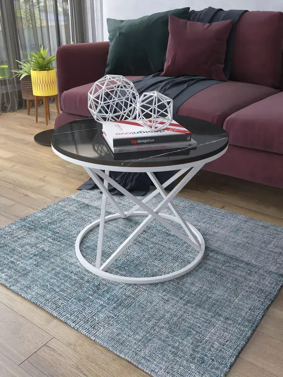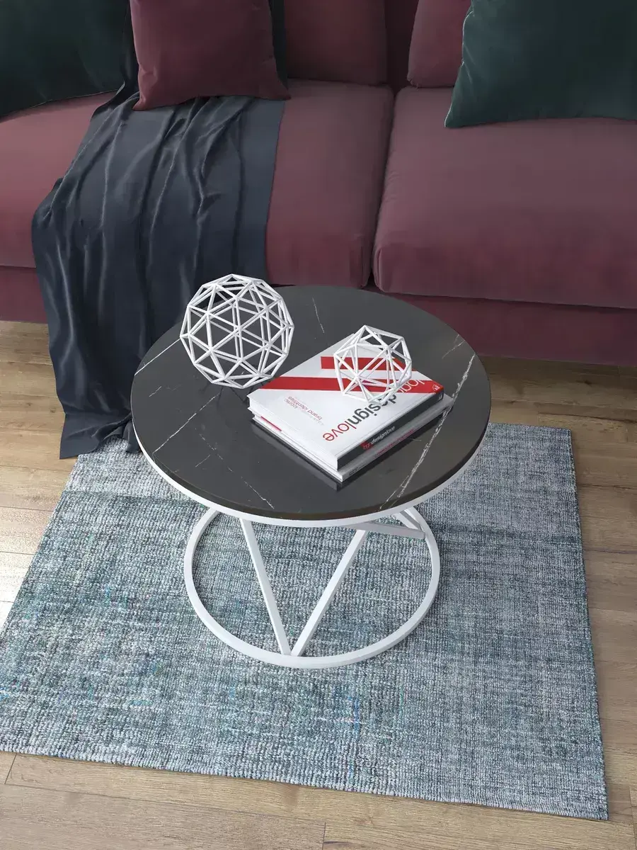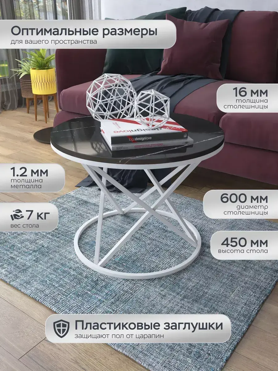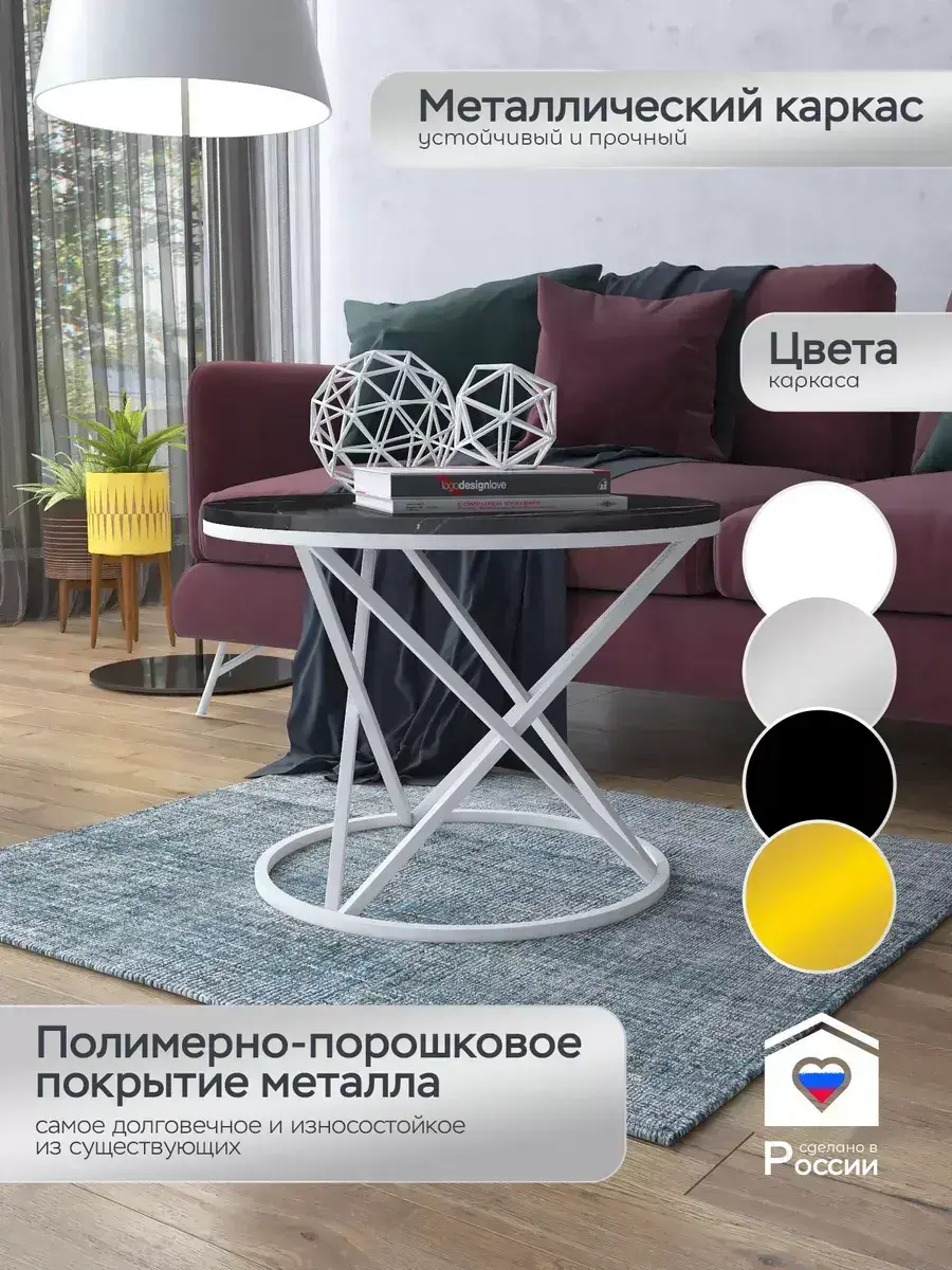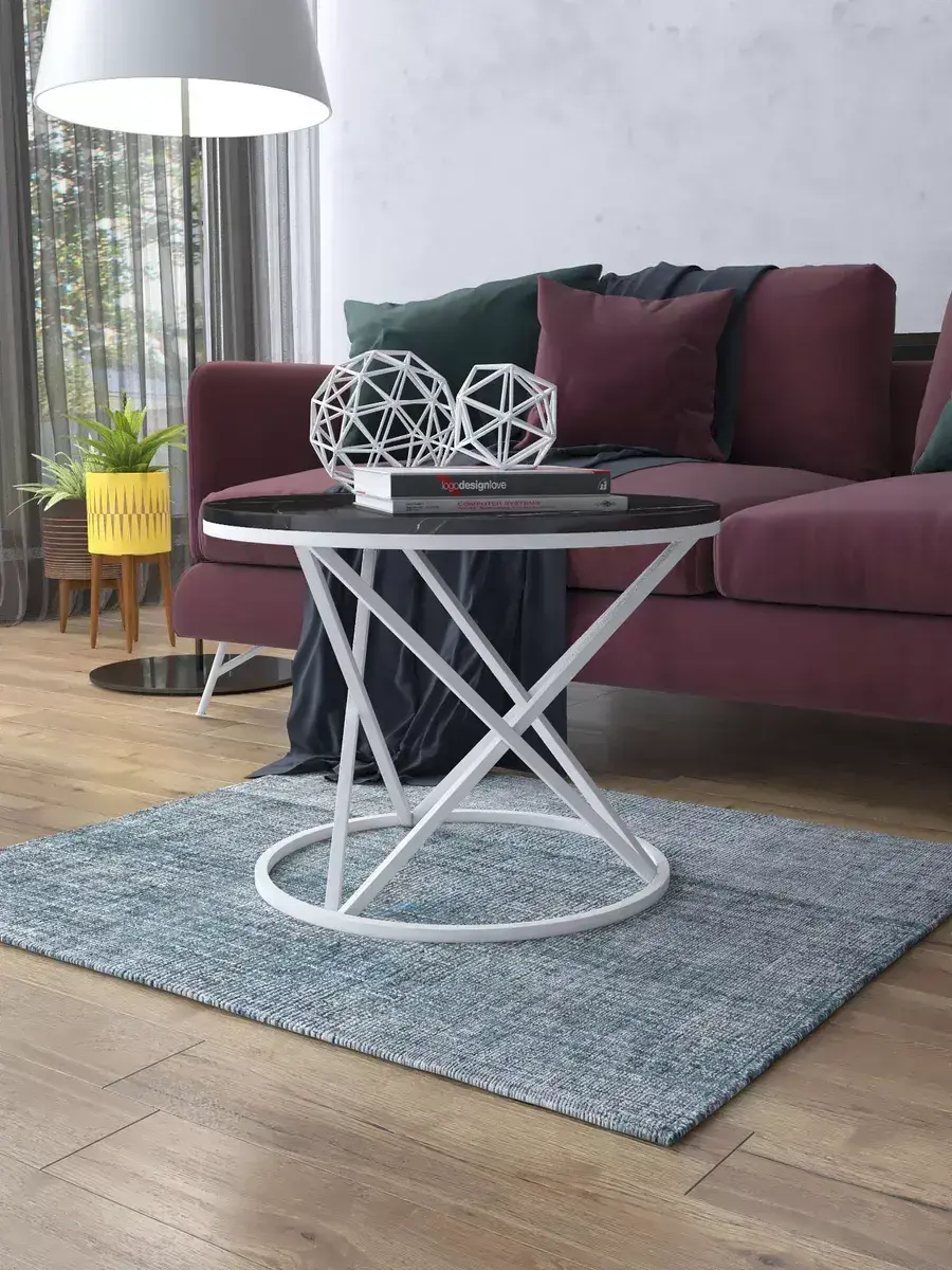 Журнальный стол "Звёздный" — это стильное и функциональное дополнение к вашему интерьеру. Его уникальный дизайн и высокое качество сразу привлекают внимание. Столешница влагостойкая, а основание покрыто прочной полимерно-порошковой краской. Благодаря этому он не только привлекательно выглядит, но и очень практичен. Конструкция столика надёжна, он выдерживает нагрузку на столешницу до 30 кг. Это позволяет разместить на нём различные предметы декора или напитки. Цвет основания: белый, столешницы: мрамор черный глянцевый. Основание выполнено из квадратной профильной трубы 15х15 толщиной 1.2мм Этот журнальный столик удобен в использовании. Он не царапает пол и не шатается, обеспечивая дополнительный комфорт при эксплуатации. Производство в России гарантирует высокое качество товара и его соответствие всем стандартам. Кроме того, столик поставляется уже собранным. Вам не придётся тратить время и силы на его сборку. Просто распакуйте его и наслаждайтесь преимуществами этого прекрасного изделия. Круглый журнальный столик со столешницей под мрамор — это не просто мебель. Это настоящее произведение искусства, которое подчеркнёт ваш вкус и станет главным акцентом в вашем доме. Покупая этот столик, вы получаете не только функциональную мебель, но и предмет декора, который добавит шарма и уюта в ваше пространство. Не упустите возможность купить этот уникальный журнальный столик и создать уютный уголок в вашем доме, который будет радовать вас каждый день.