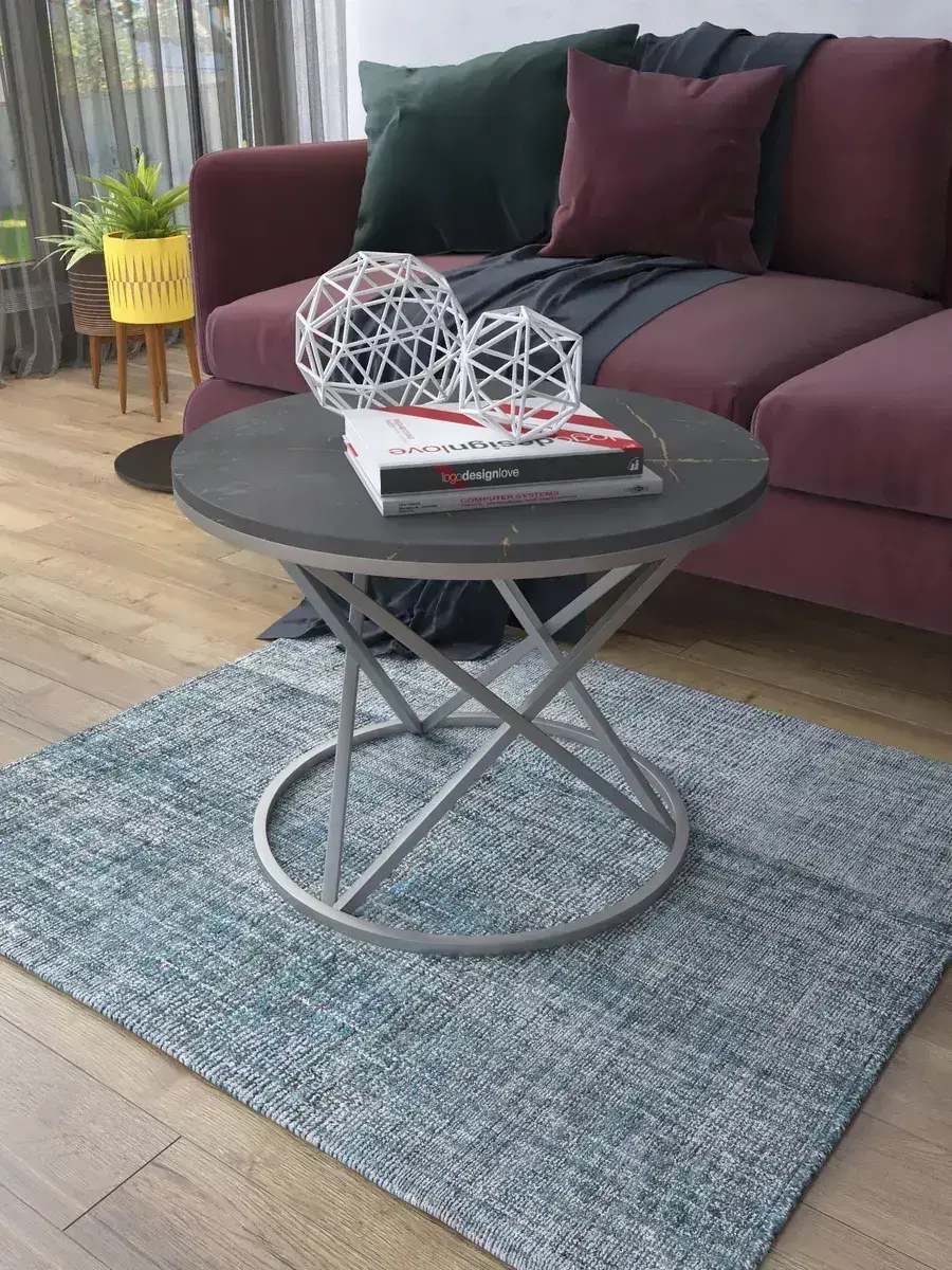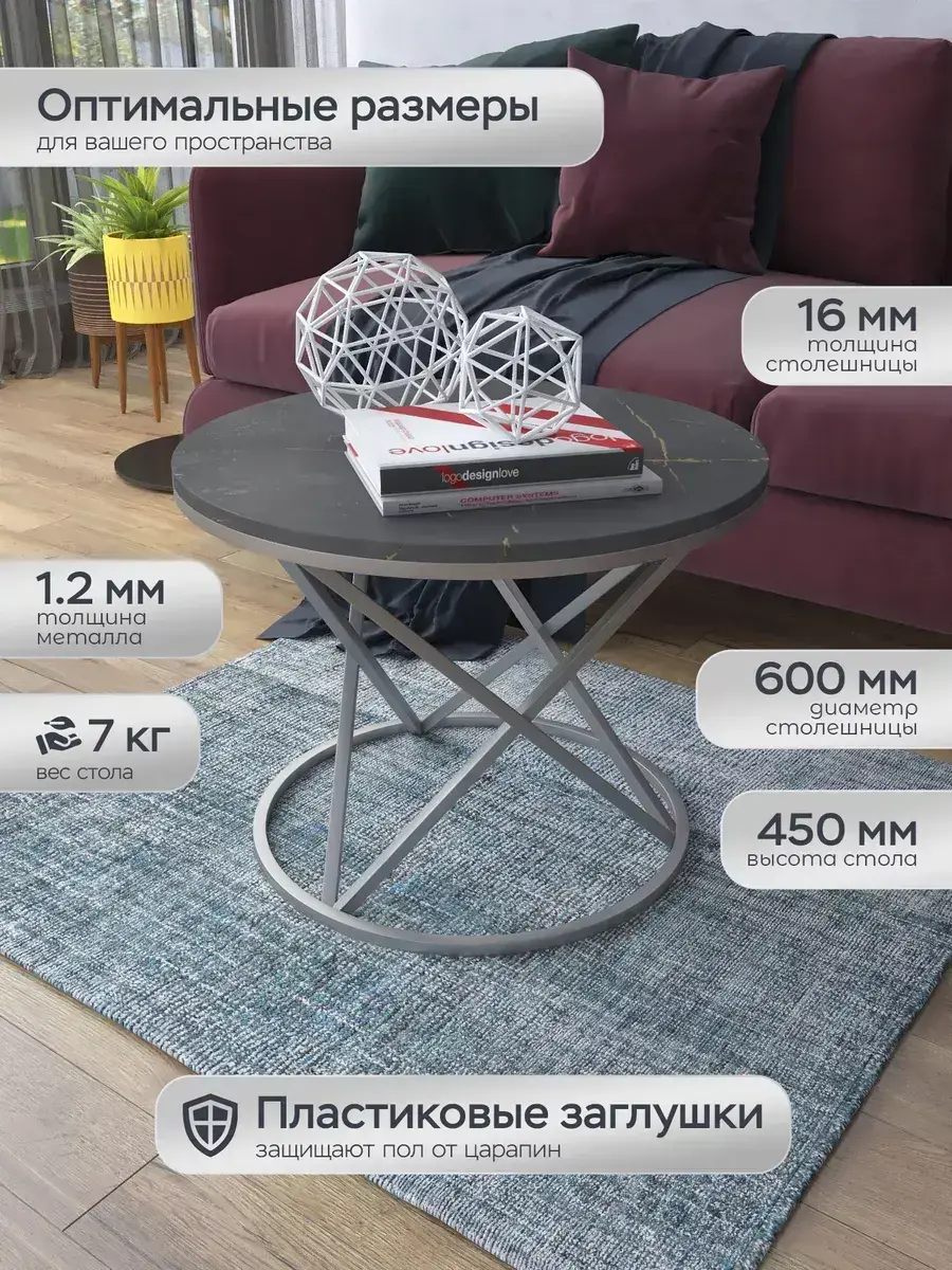 Журнальный стол "Звёздный" — это стильное и функциональное дополнение к вашему интерьеру. Его уникальный дизайн и высокое качество сразу привлекают внимание. Столешница влагостойкая, а основание покрыто прочной полимерно-порошковой краской. Благодаря этому он не только привлекательно выглядит, но и очень практичен. Конструкция столика надёжна, он выдерживает нагрузку на столешницу до 30 кг. Это позволяет разместить на нём различные предметы декора или напитки. Цвет основания: серебро, столешницы: мрамор золото черный матовый. Основание выполнено из квадратной профильной трубы 15х15 толщиной 1.2мм Этот журнальный столик удобен в использовании. Он не царапает пол и не шатается, обеспечивая дополнительный комфорт при эксплуатации. Производство в России гарантирует высокое качество товара и его соответствие всем стандартам. Кроме того, столик поставляется уже собранным. Вам не придётся тратить время и силы на его сборку. Просто распакуйте его и наслаждайтесь преимуществами этого прекрасного изделия. Круглый журнальный столик со столешницей под мрамор — это не просто мебель. Это настоящее произведение искусства, которое подчеркнёт ваш вкус и станет главным акцентом в вашем доме. Покупая этот столик, вы получаете не только функциональную мебель, но и предмет декора, который добавит шарма и уюта в ваше пространство. Не упустите возможность купить этот уникальный журнальный столик и создать уютный уголок в вашем доме, который будет радовать вас каждый день.